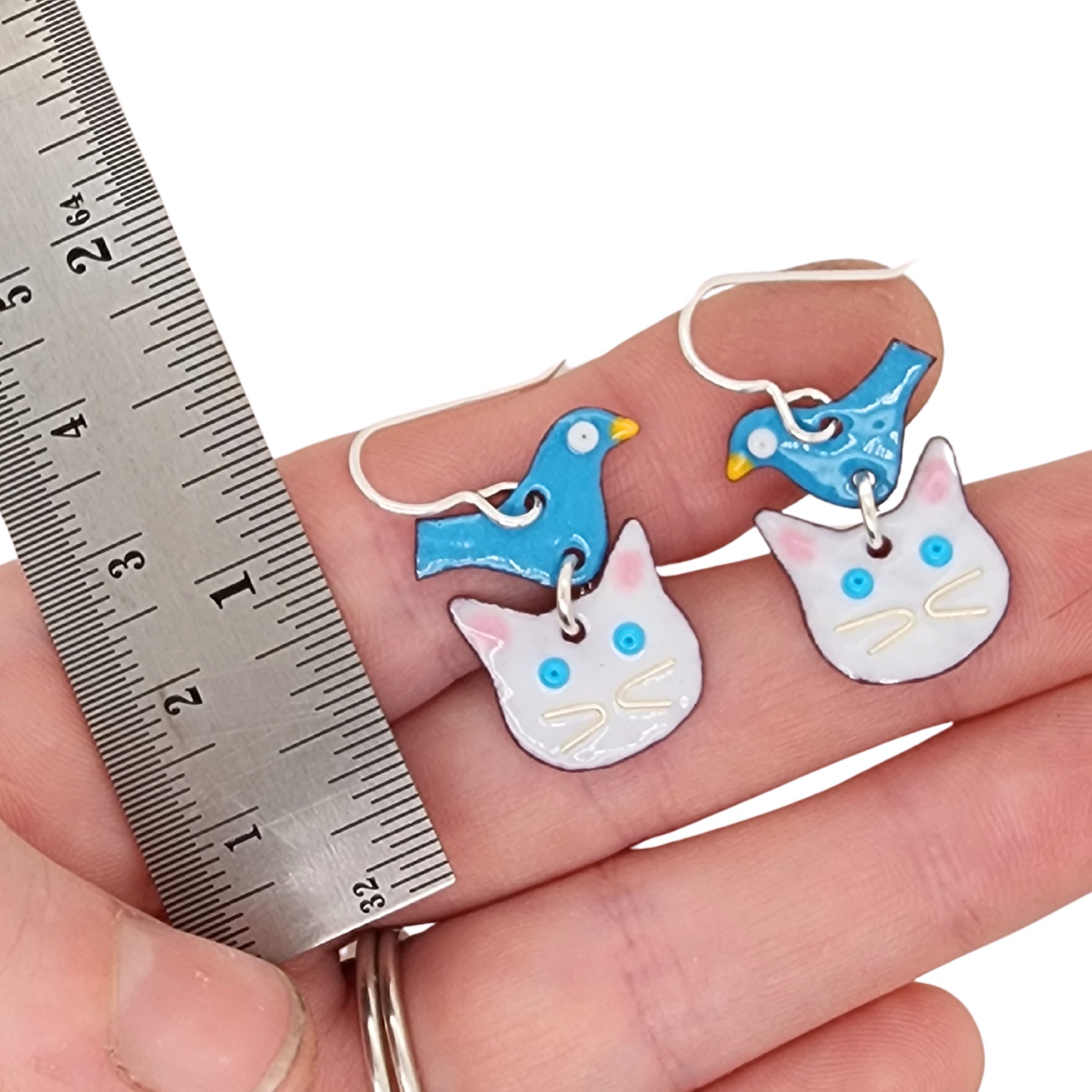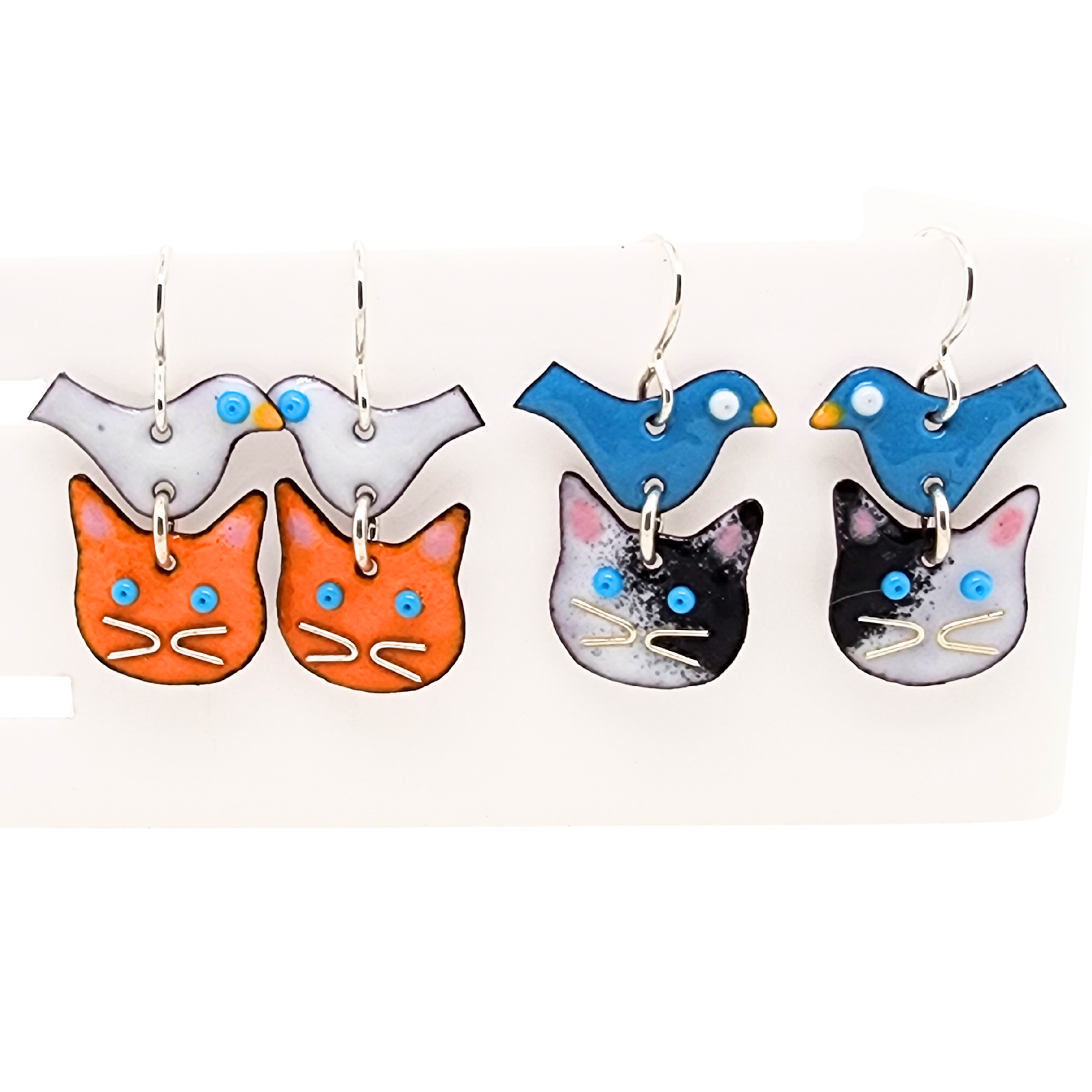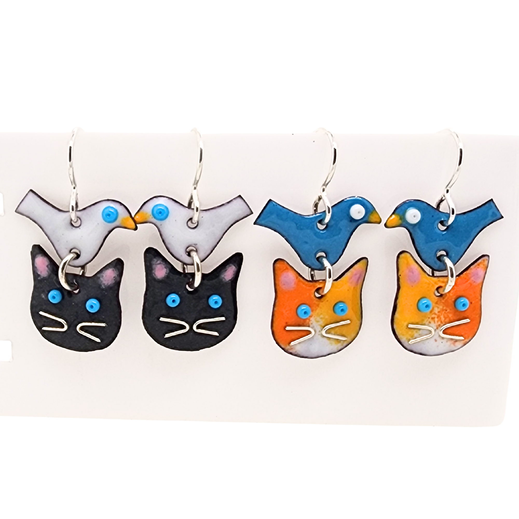 These meticulously crafted earrings showcase a delightful cat head design with a whimsical bird perched on it, expertly made with glass enamel fused to copper. Ideal for pet enthusiasts, cat lovers, and those embracing the title of cat ladies, these earrings bring a touch of whimsy to any wardrobe.