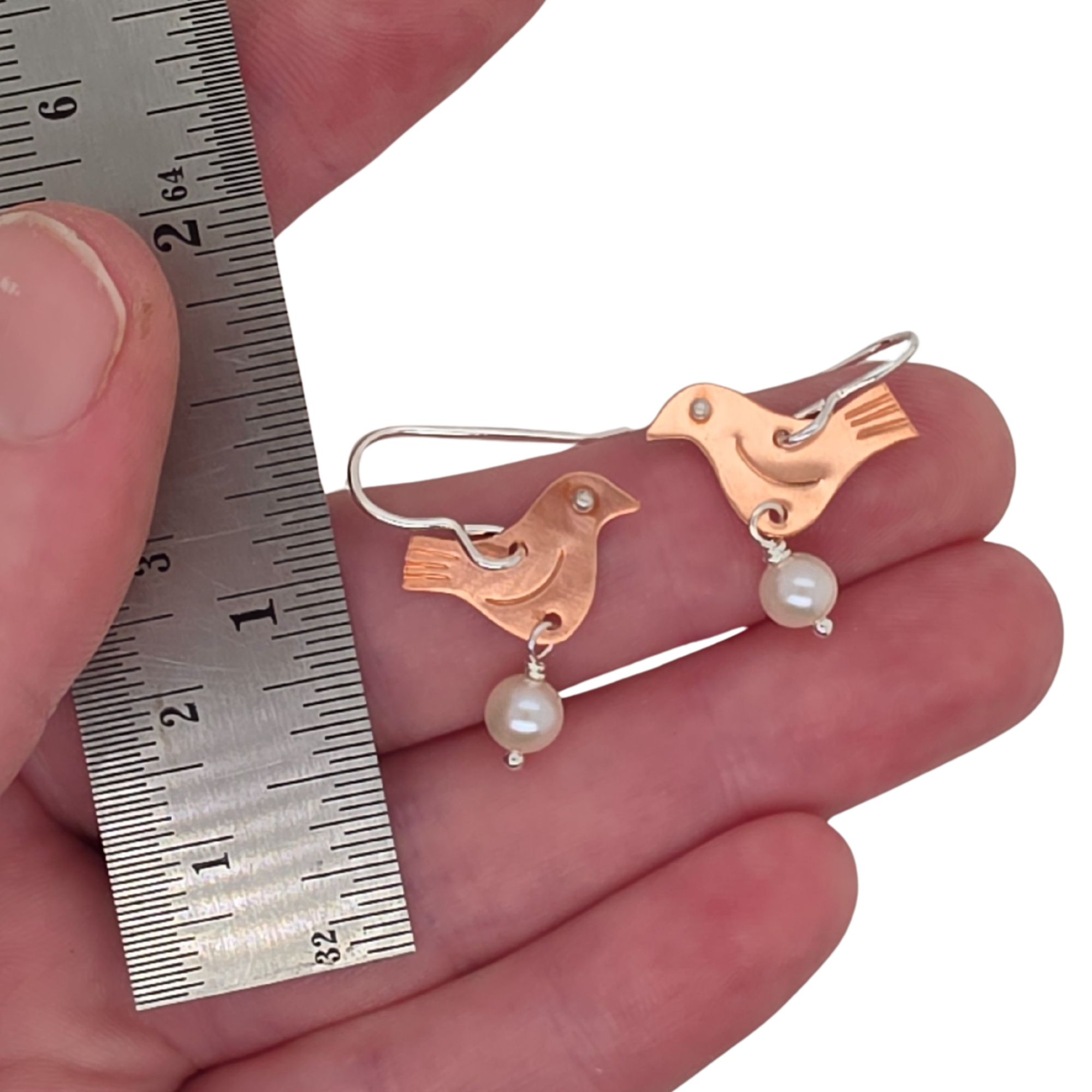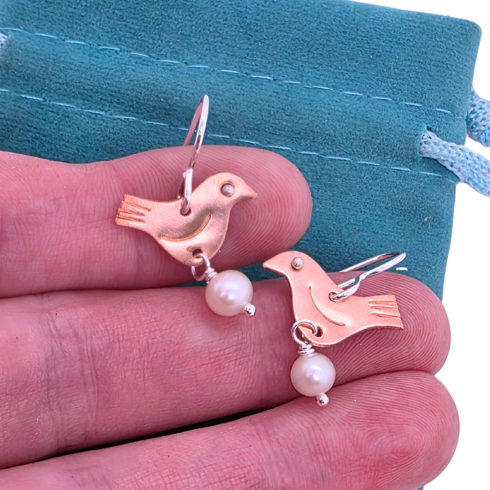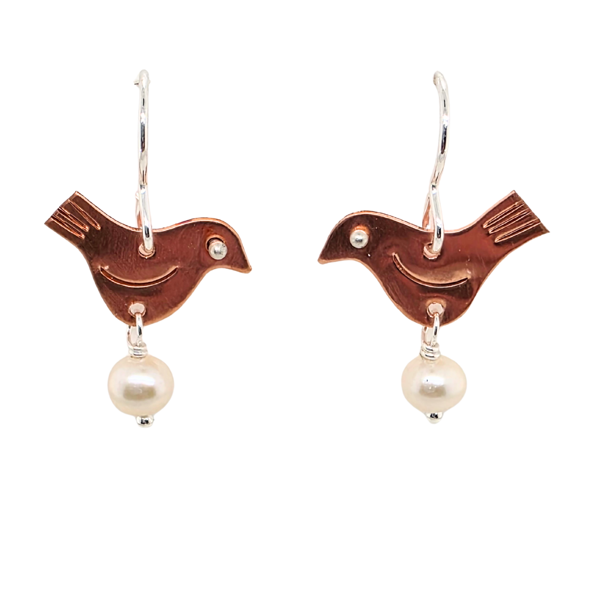 These petite dangle earrings are handcrafted from raw copper sheet, hand-stamped to bring out bird-wing and tail details. White freshwater pearls gently swing from sterling silver findings, giving lightness and a touch of whimsy. The materials are raw copper (not sealed), so each bird will darken naturally over time—giving your pair a unique character with every wear. Perfect for those who love nature, artisan craftsmanship, and jewelry with a story.