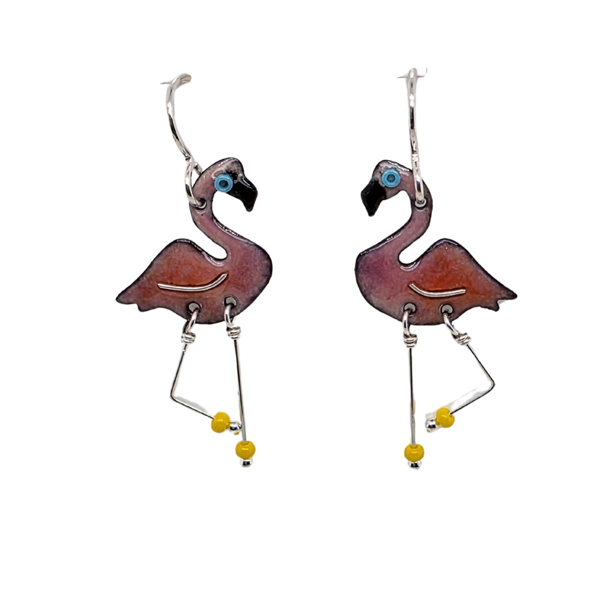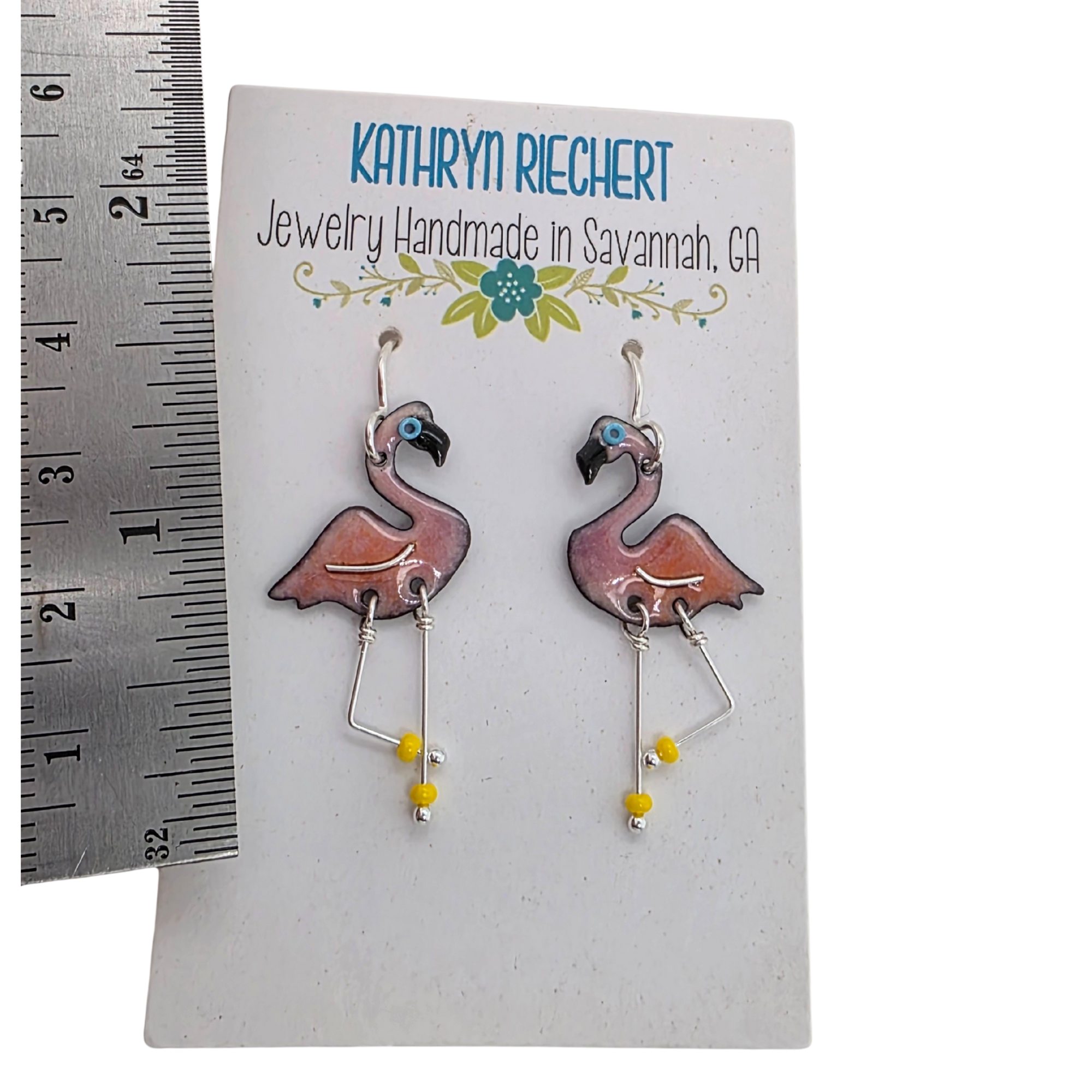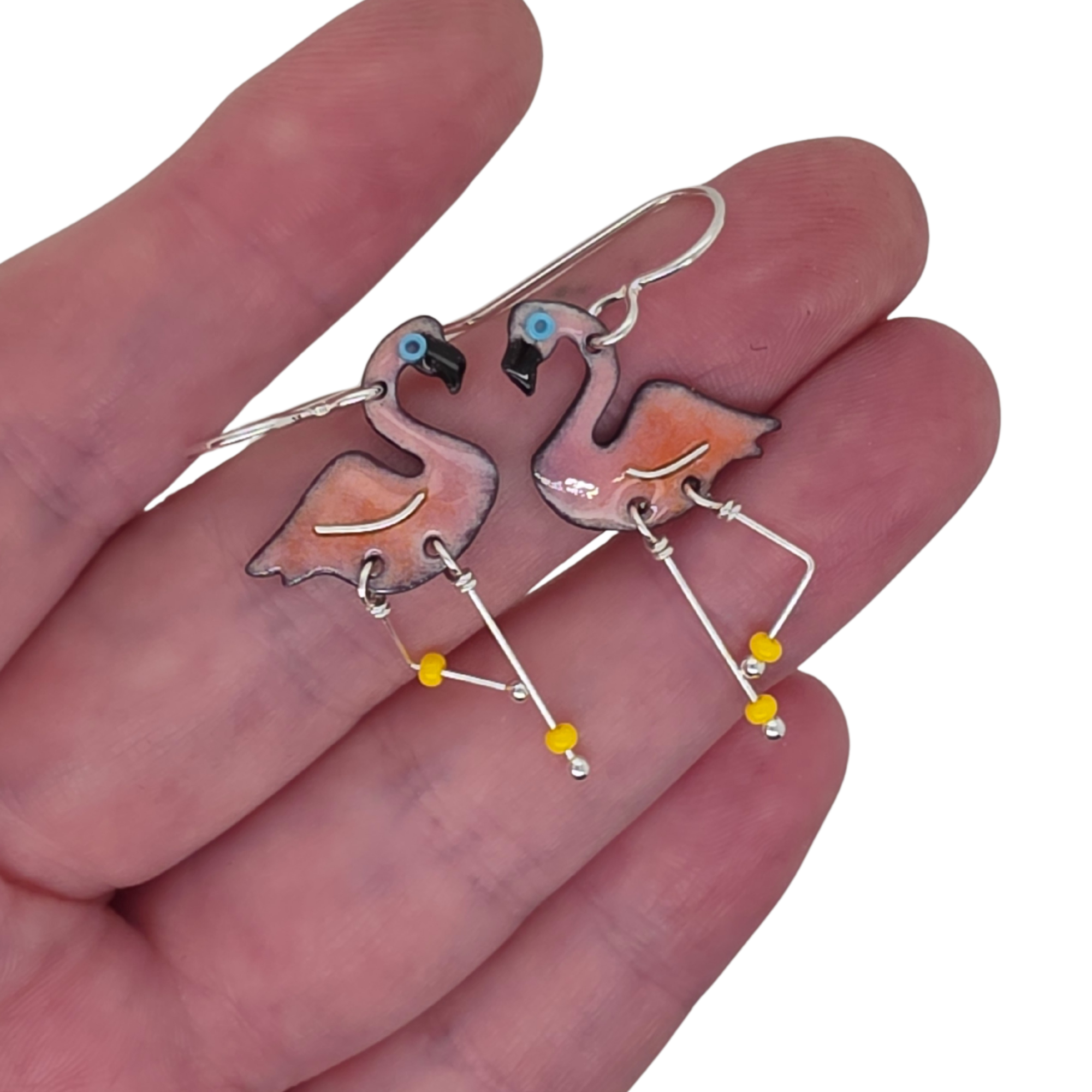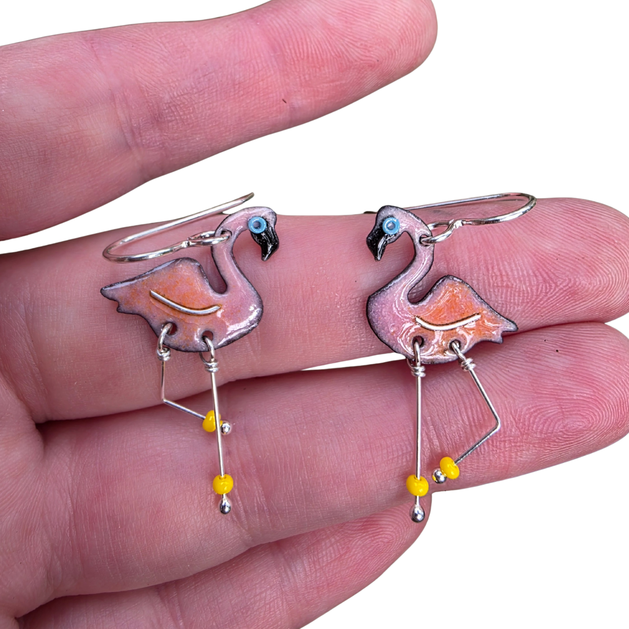 Perfect for your Florida vacation, or a trip to the beach, or just to be reminded of your love for pink flamingos :) These earrings are made from glass enamel fused to copper. Sterling silver legs dangle with a little yellow/orange glass bead to accent them. The ear wires are sterling silver.