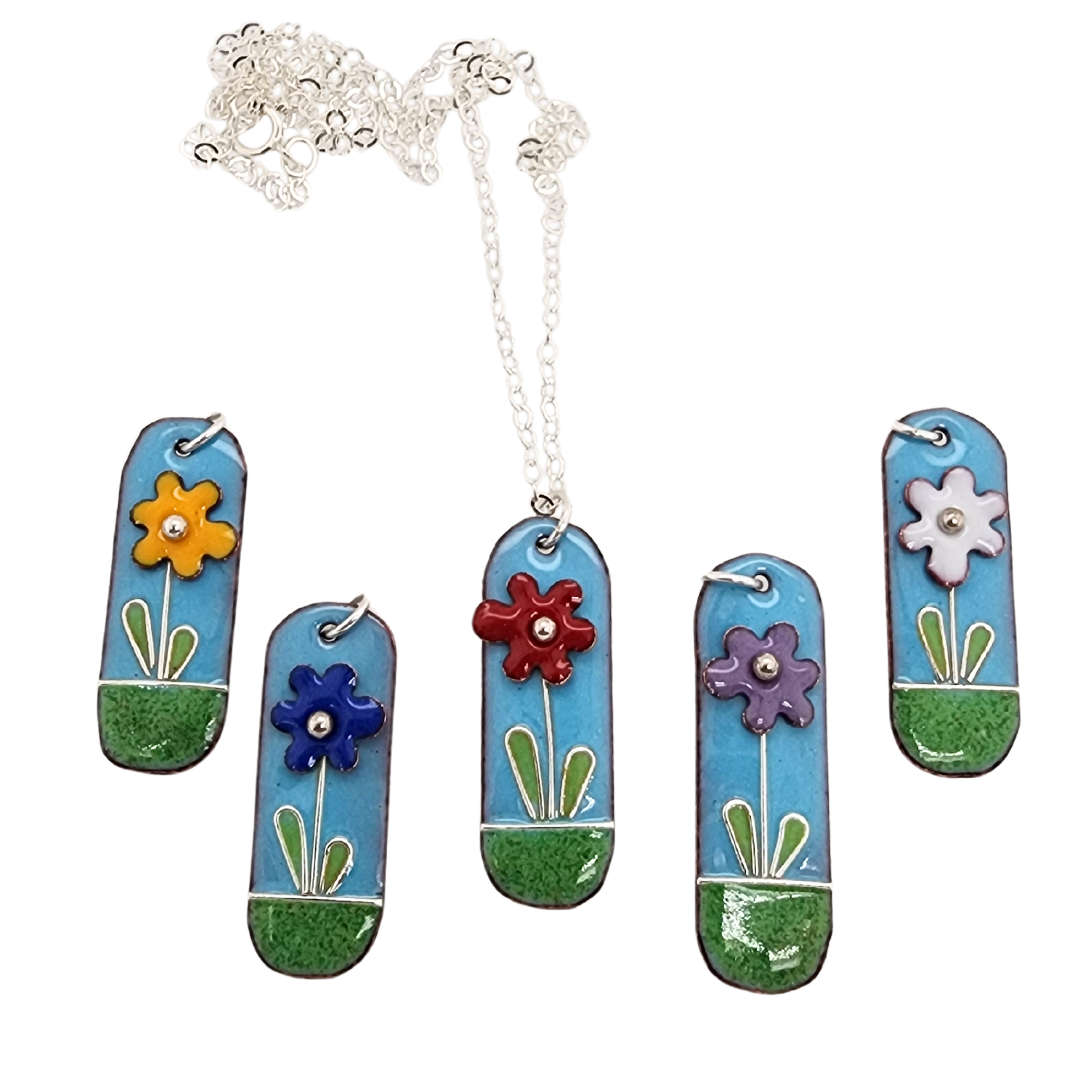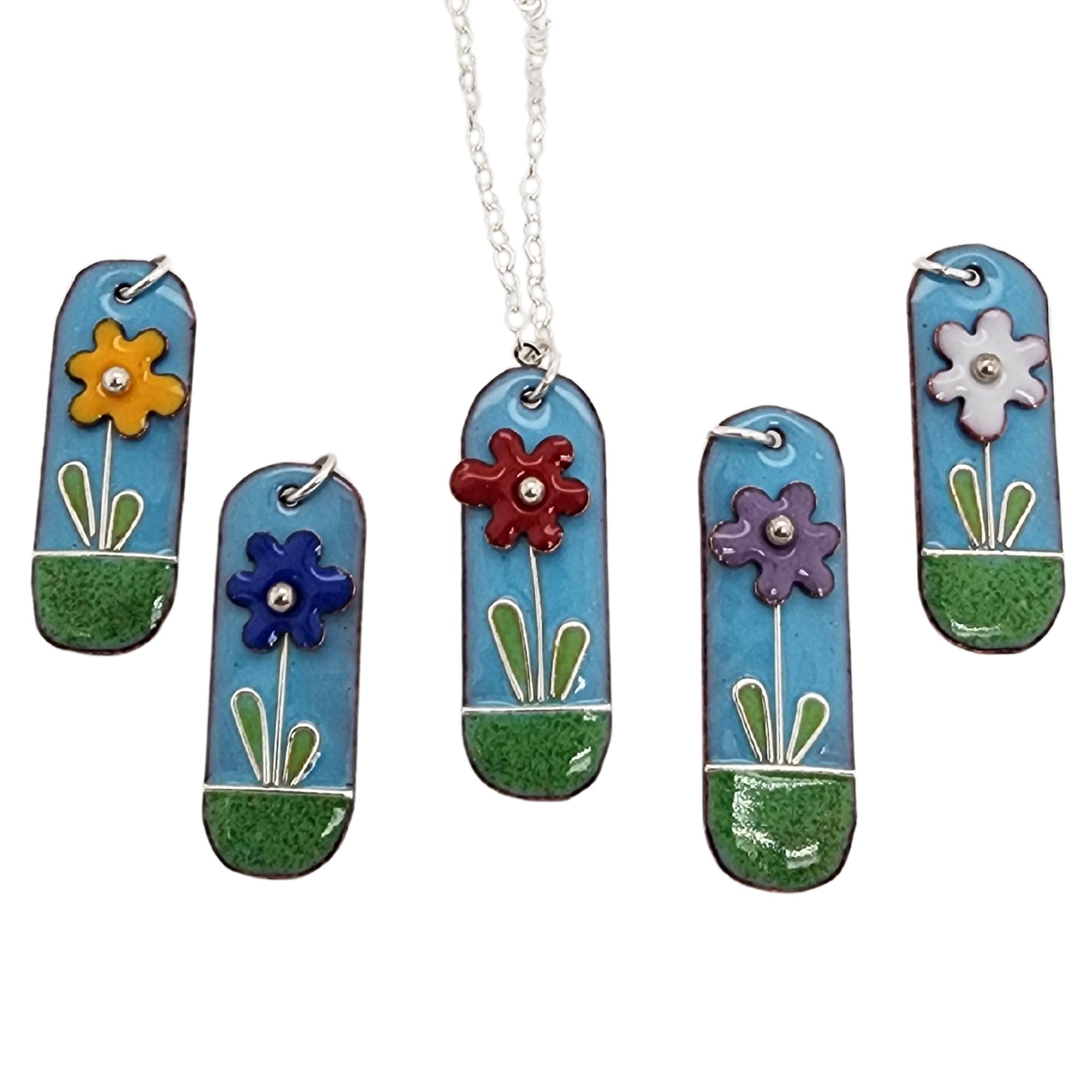 Embrace the vibrant spirit of spring and summer with these delightful Flower-Scapes – the epitome of joy and nature's beauty! Glass enamel, copper, and sterling silver come together to create a unique symphony of color and playfulness. Elevate your style and let your jewelry reflect the beauty of the natural world.