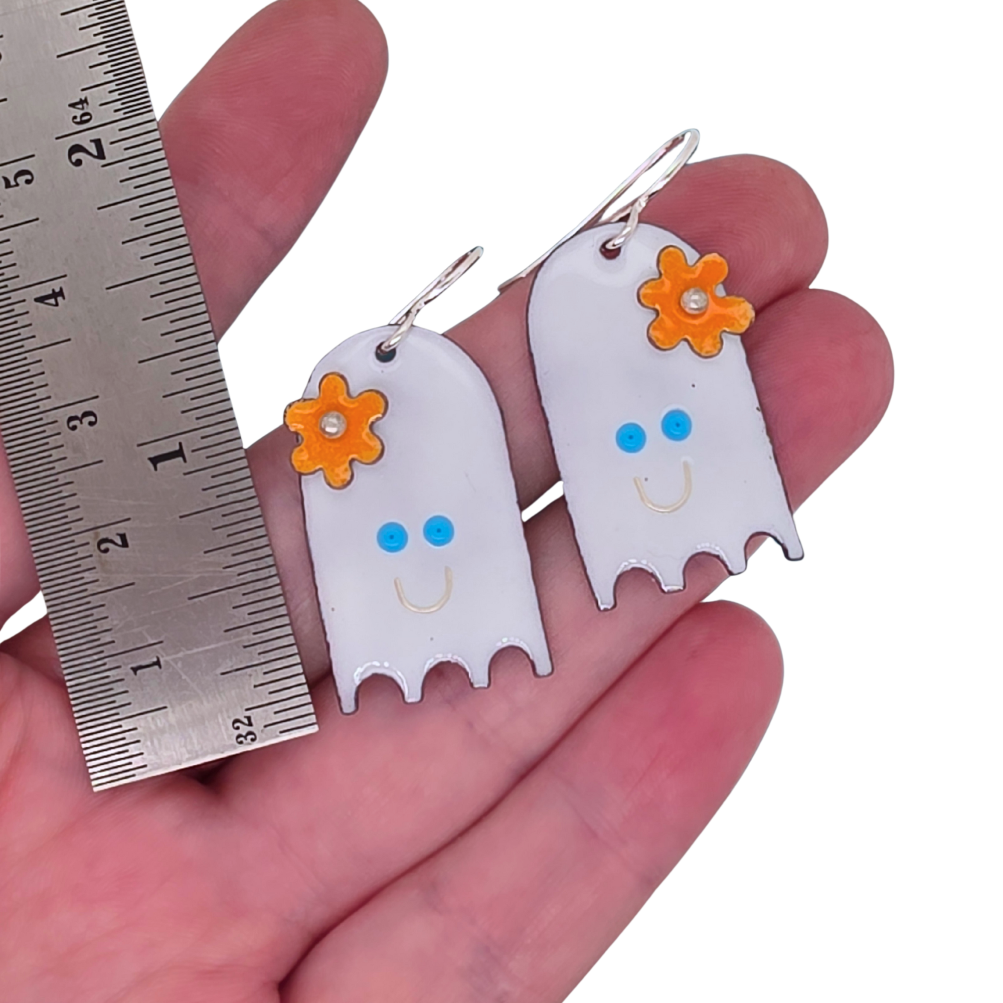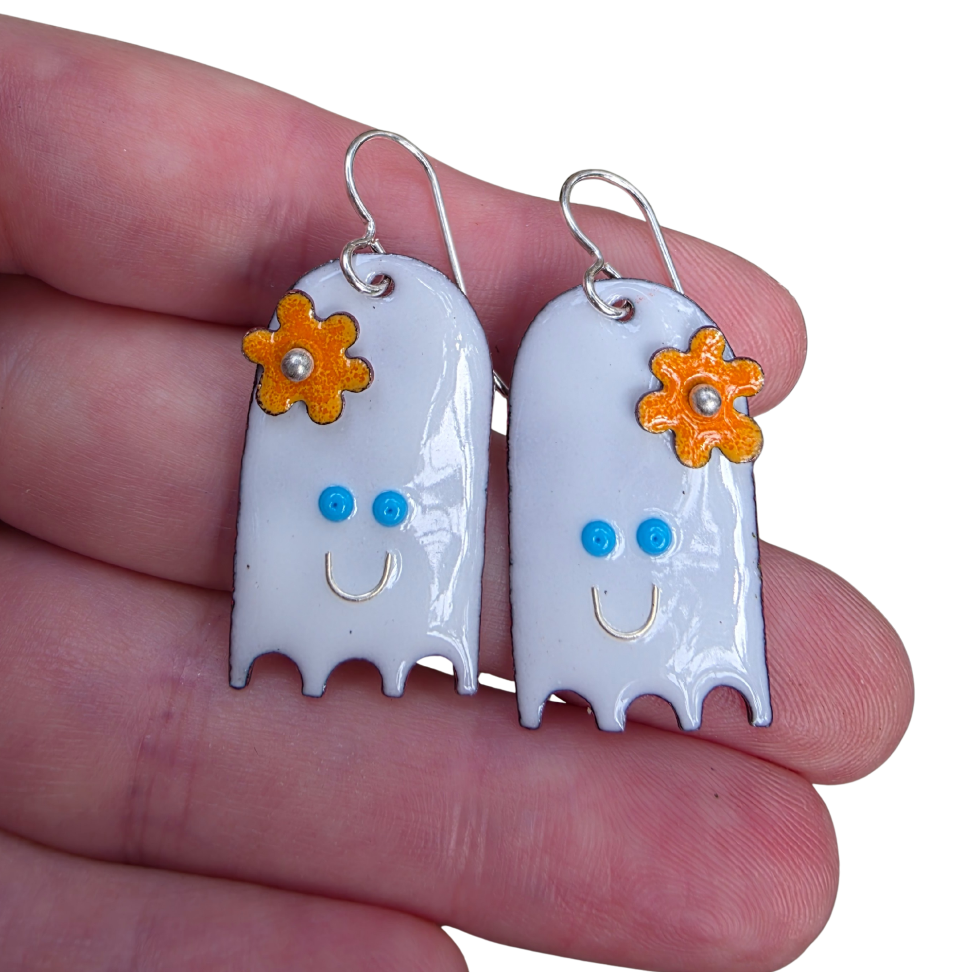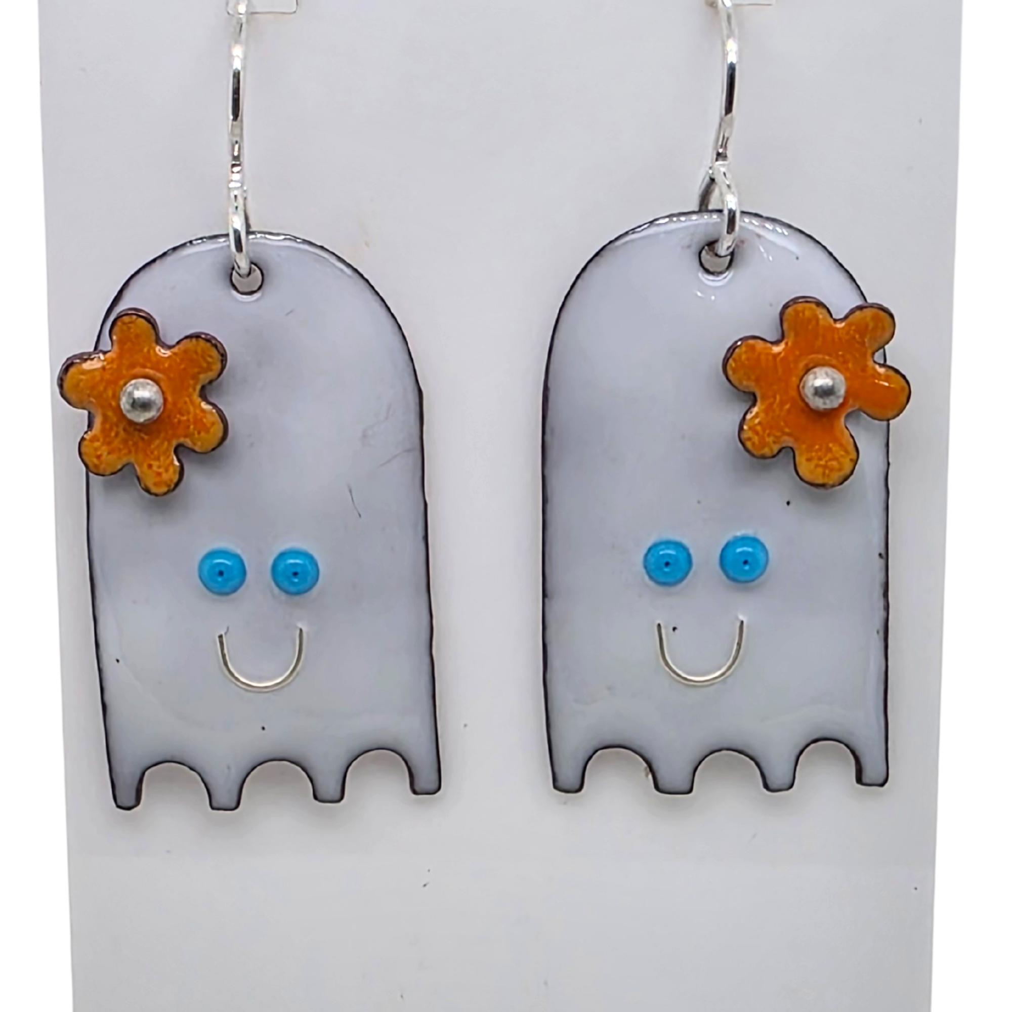 Bring a little playful charm to your day with these handmade happy ghost earrings! Crafted from glass enamel fused onto copper, each ghost features bright blue eyes, a cheerful smile, and a whimsical orange flower on top. The flower is extra fun — it spins when touched, adding a delightful interactive detail.
