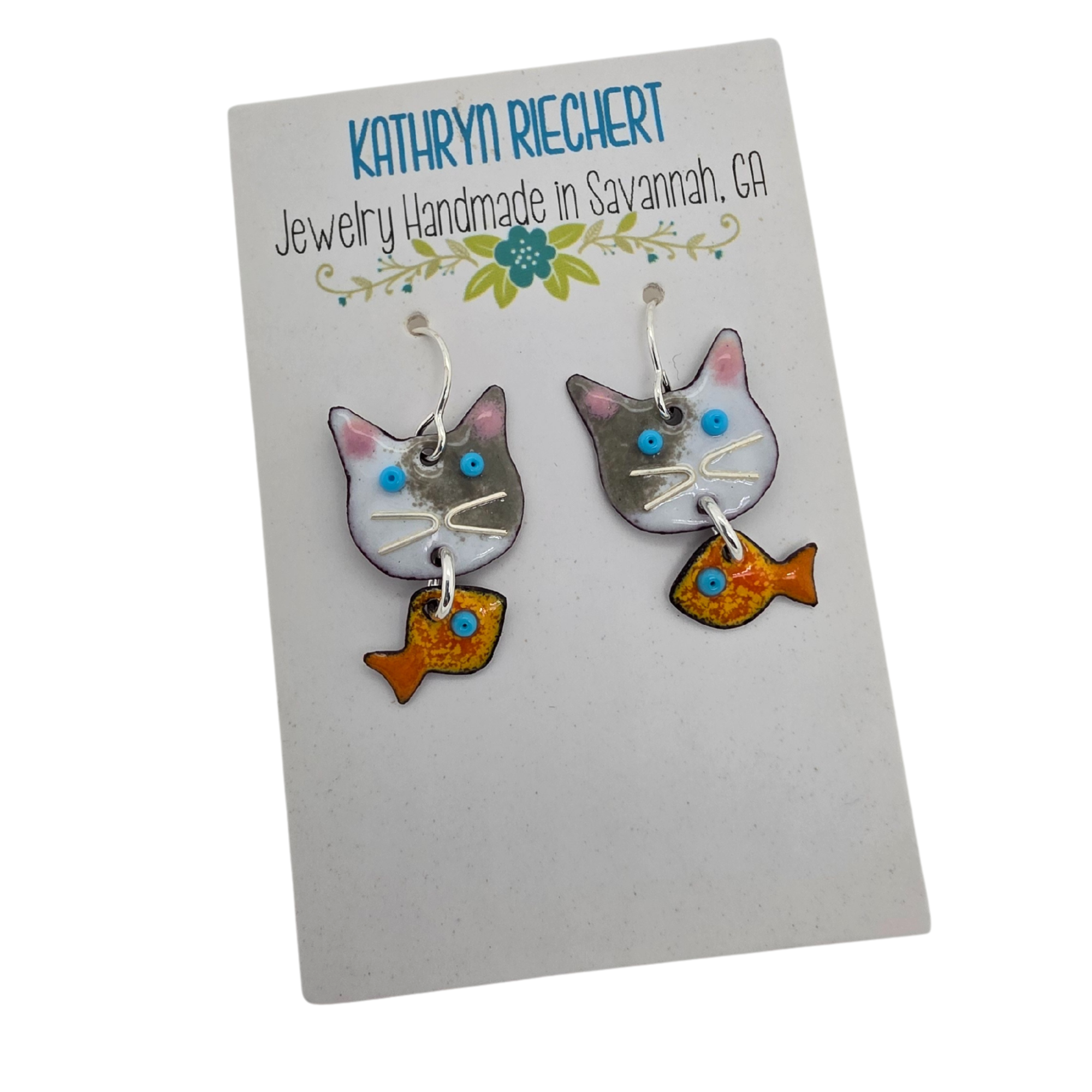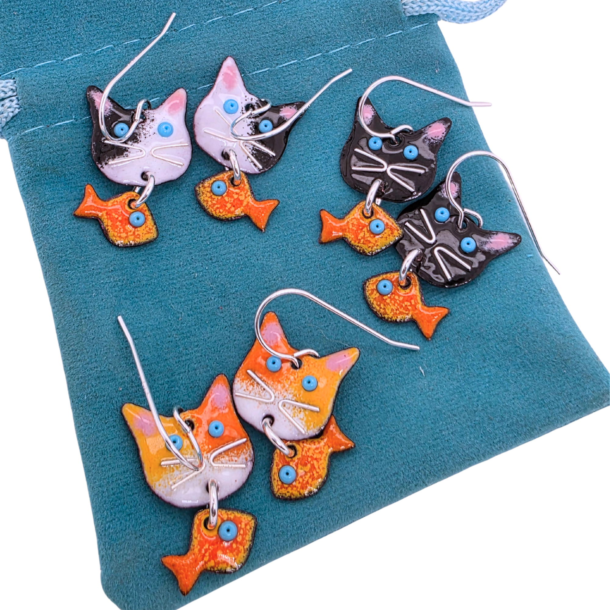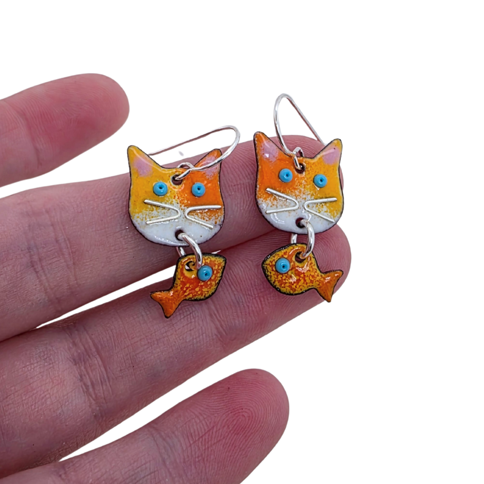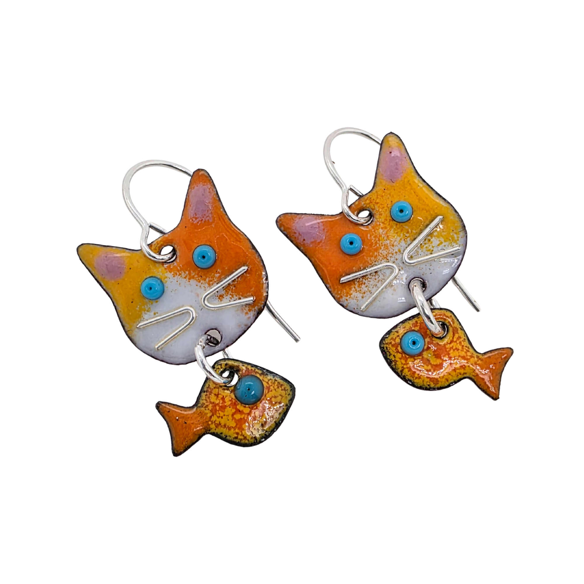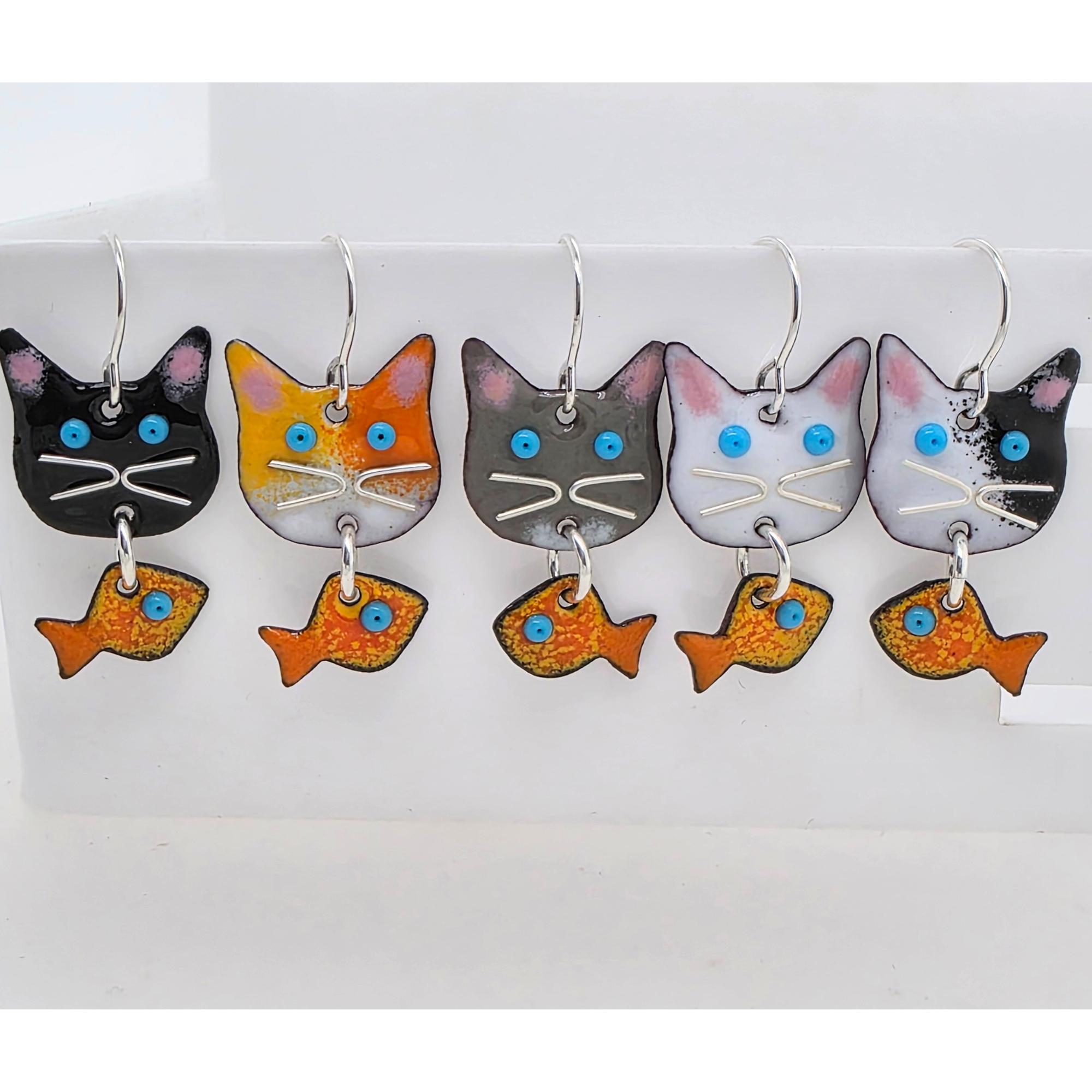 These whimsical Hungry Cat Earrings are sure to delight cat lovers and anyone who enjoys a touch of humor in their jewelry. Each earring features a curious cat face handmade from glass enamel fused to copper, with a bright goldfish dangling below—capturing that classic “cat and fish” moment.