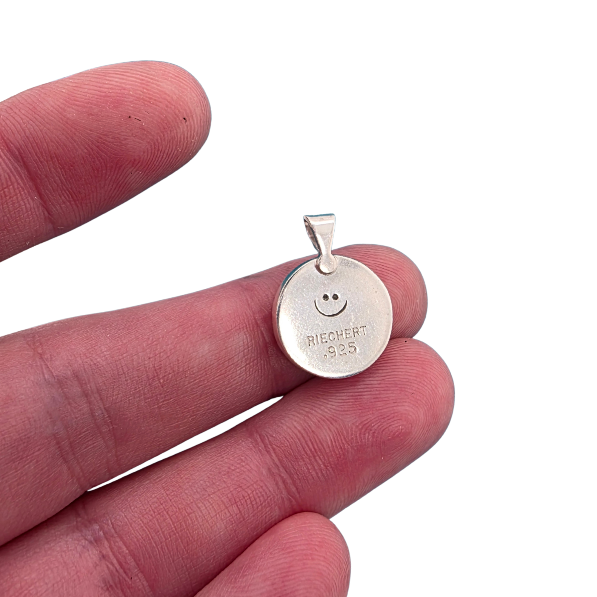 The back of the pendant is stamped with a smiley face.