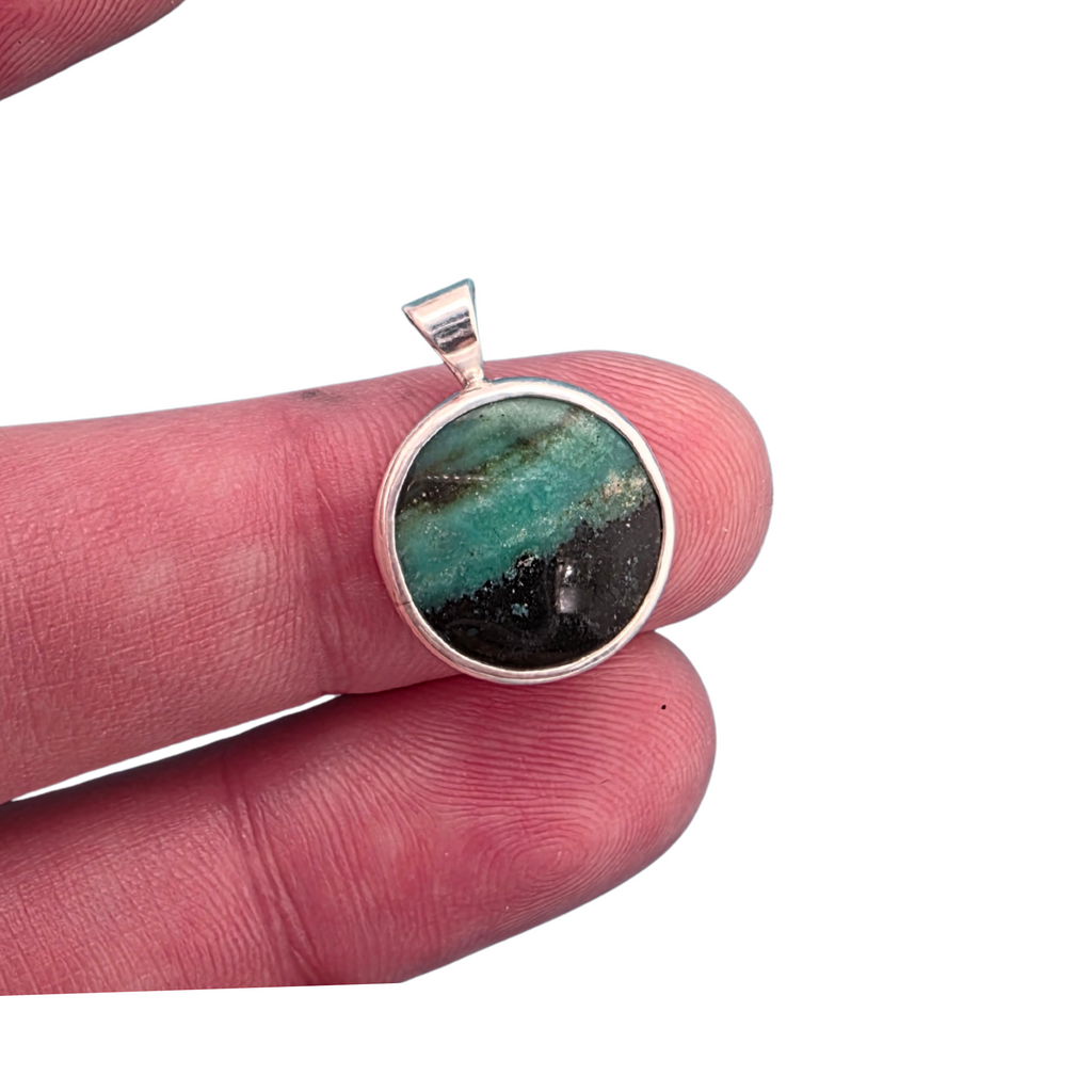 This pendant features an Indonesian Opalized Wood gemstone that is bezel set with sterling silver. The gemstone has lovely dark beachy colors.