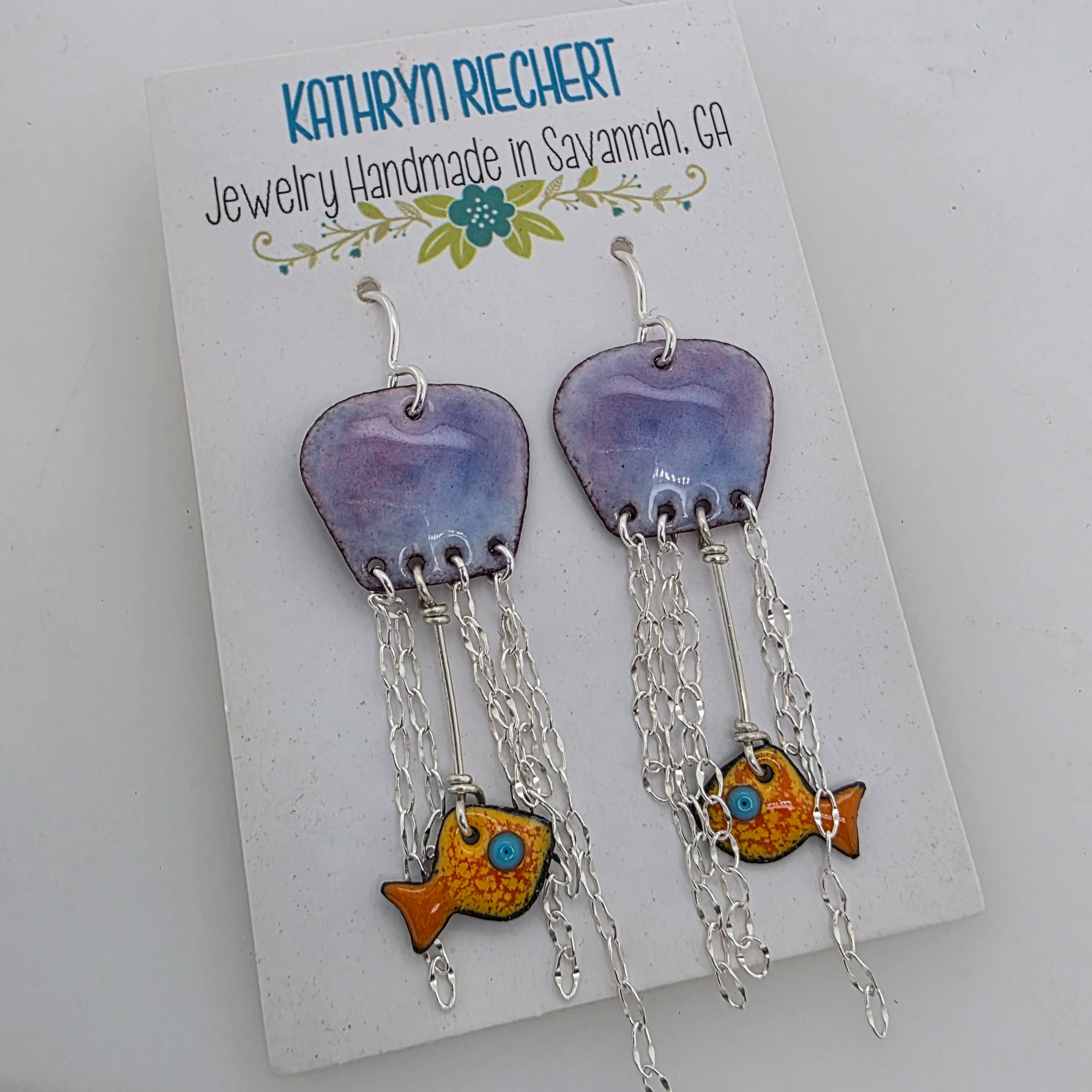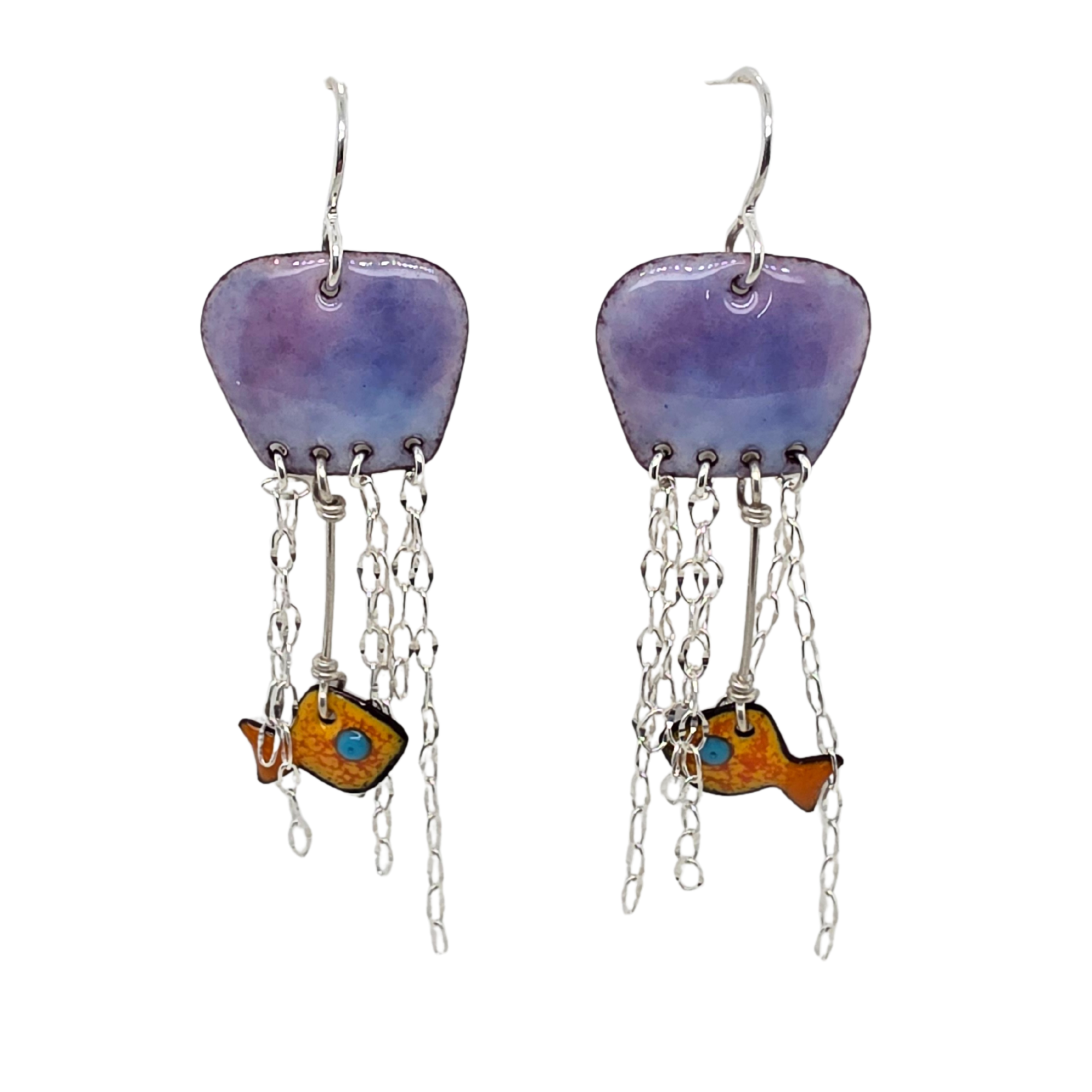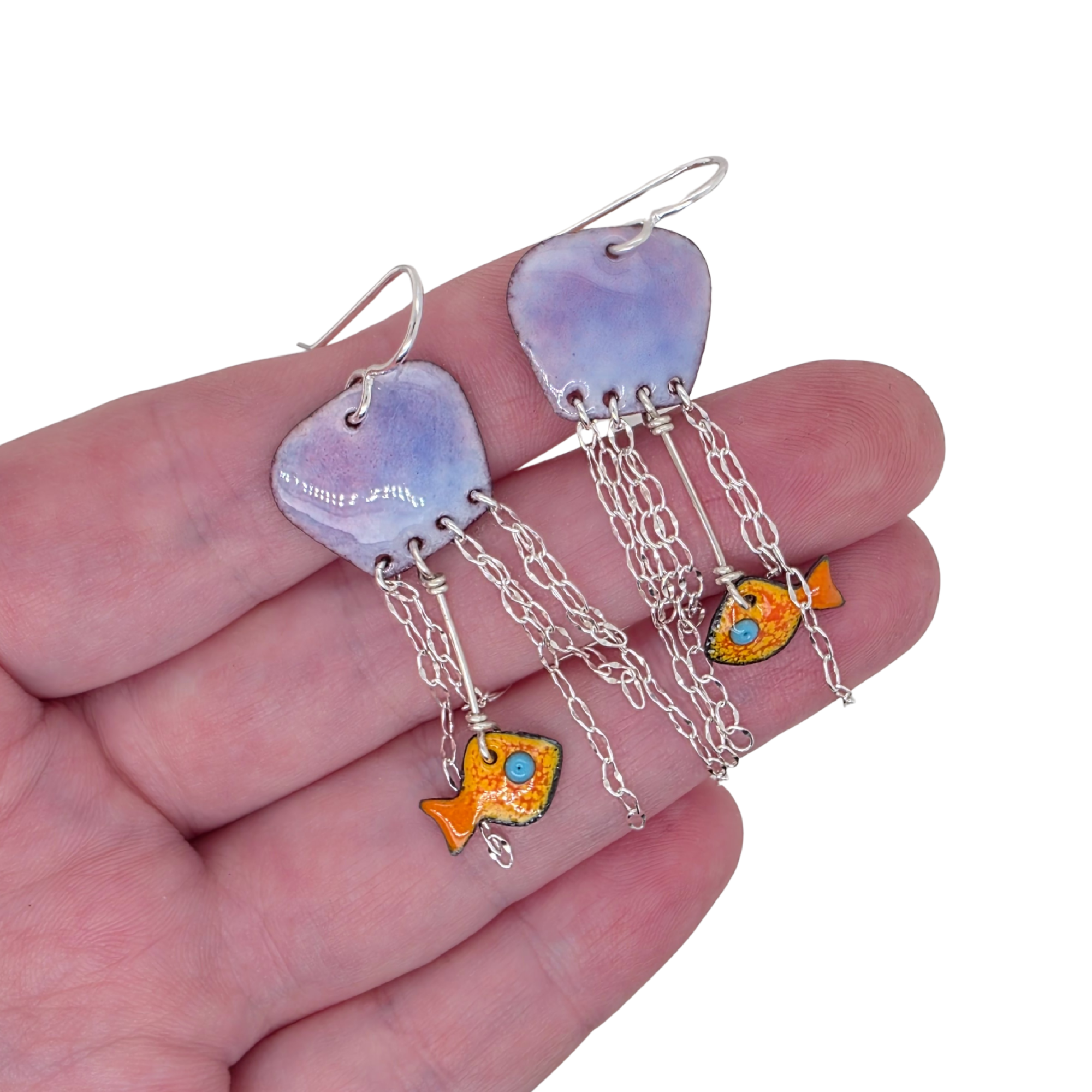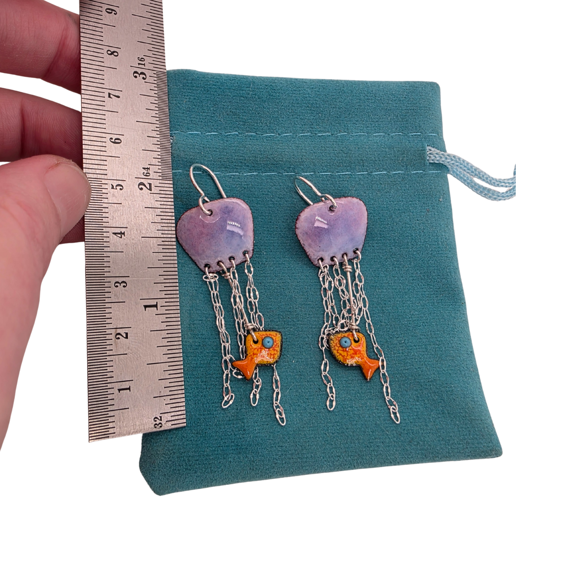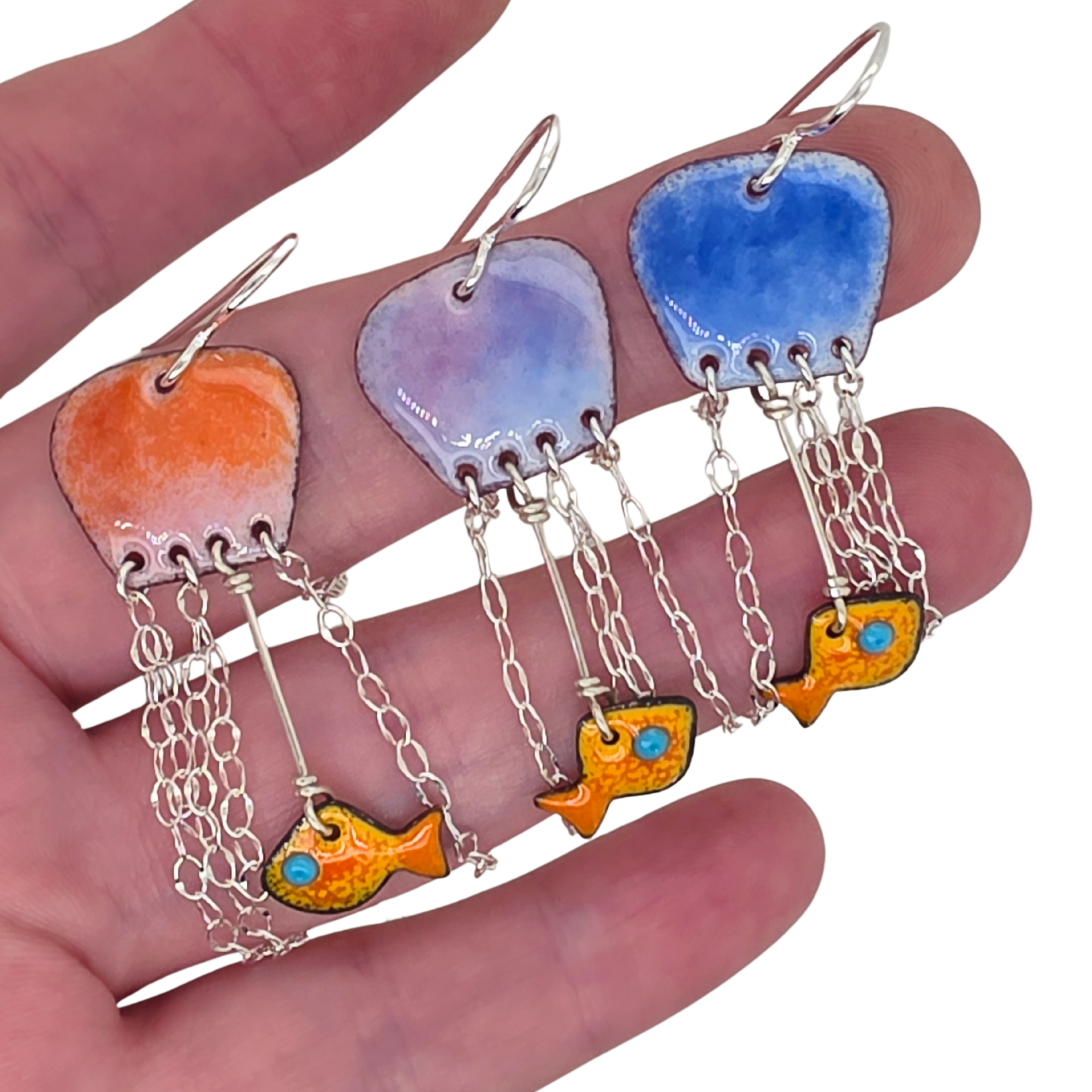 Dive into playful style with these handmade jellyfish earrings, crafted from glass enamel fused to copper. Each jellyfish features a colorful enameled body and delicate sterling silver chains that sway gracefully like tentacles. Hidden in the design is a tiny goldfish caught among the tentacles — a whimsical surprise that makes these earrings truly unique.