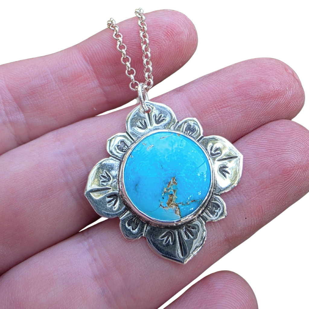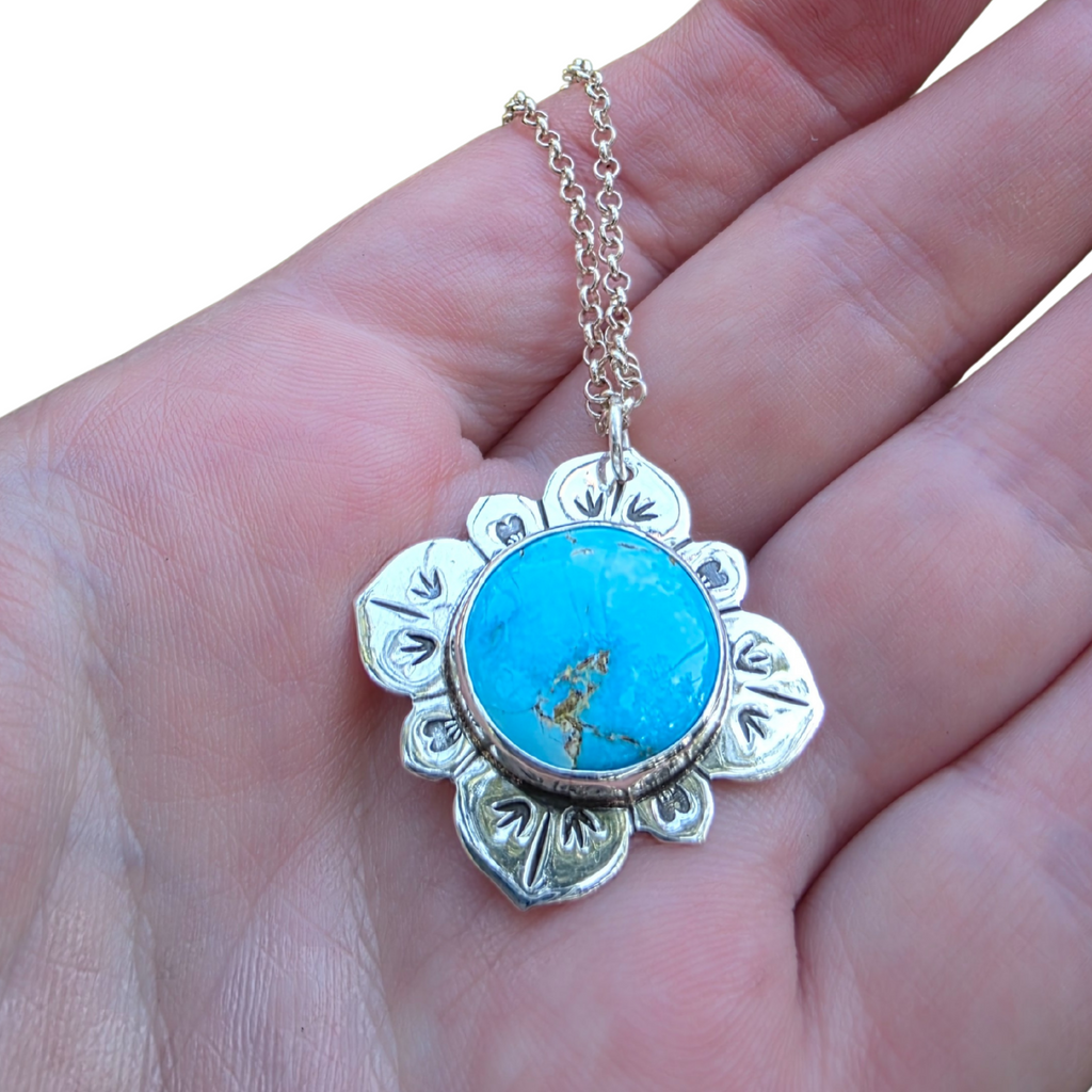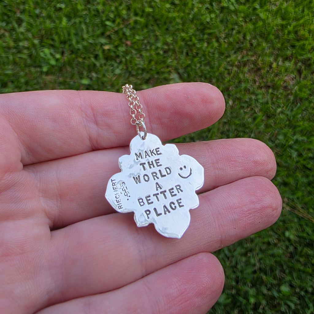 This pendant is created from solid sterling silver with a kingman turquoise gemstone. The front and back are both hand stamped, and the back reads ' MAKE THE WORLD A BETTER PLACE '