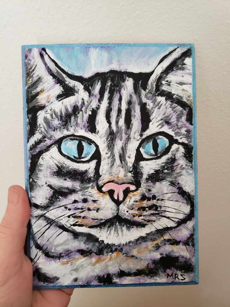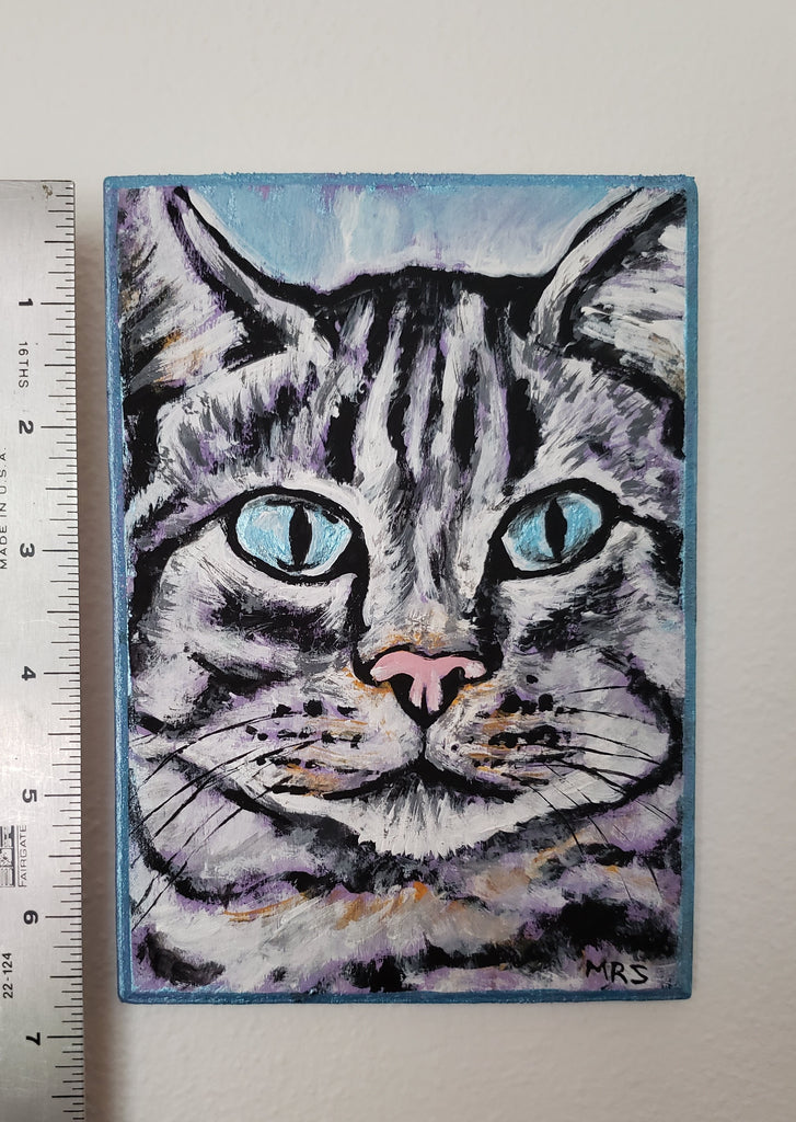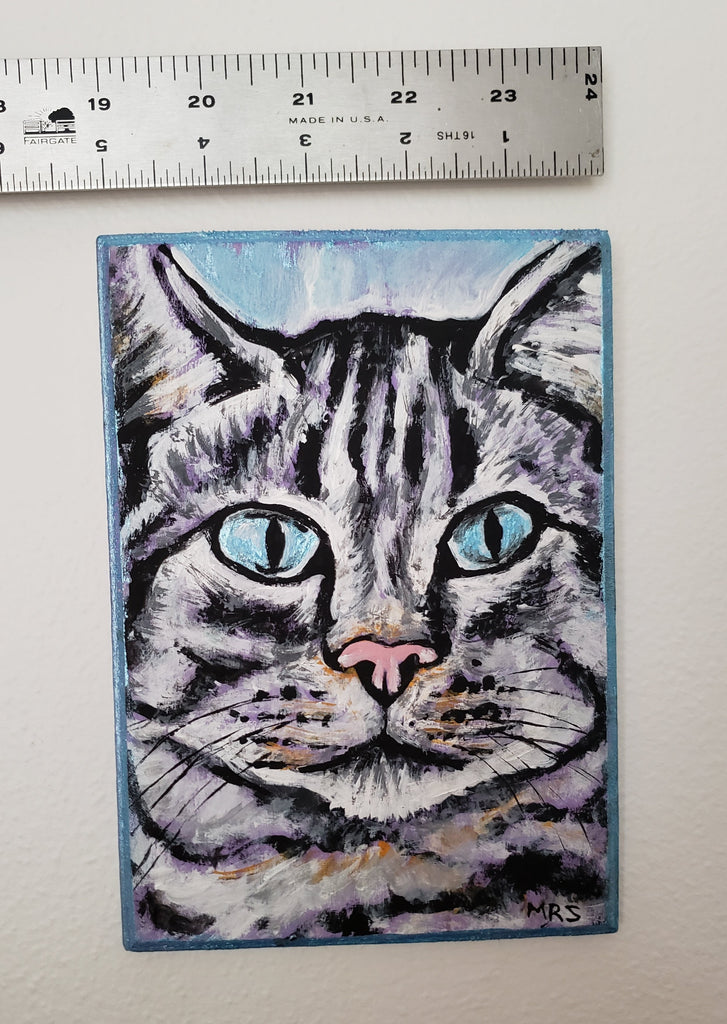 This original folk art style painting is 5x7" in size and is painted with acrylic paints on a wooden base. A small hanger has been affixed to the back.