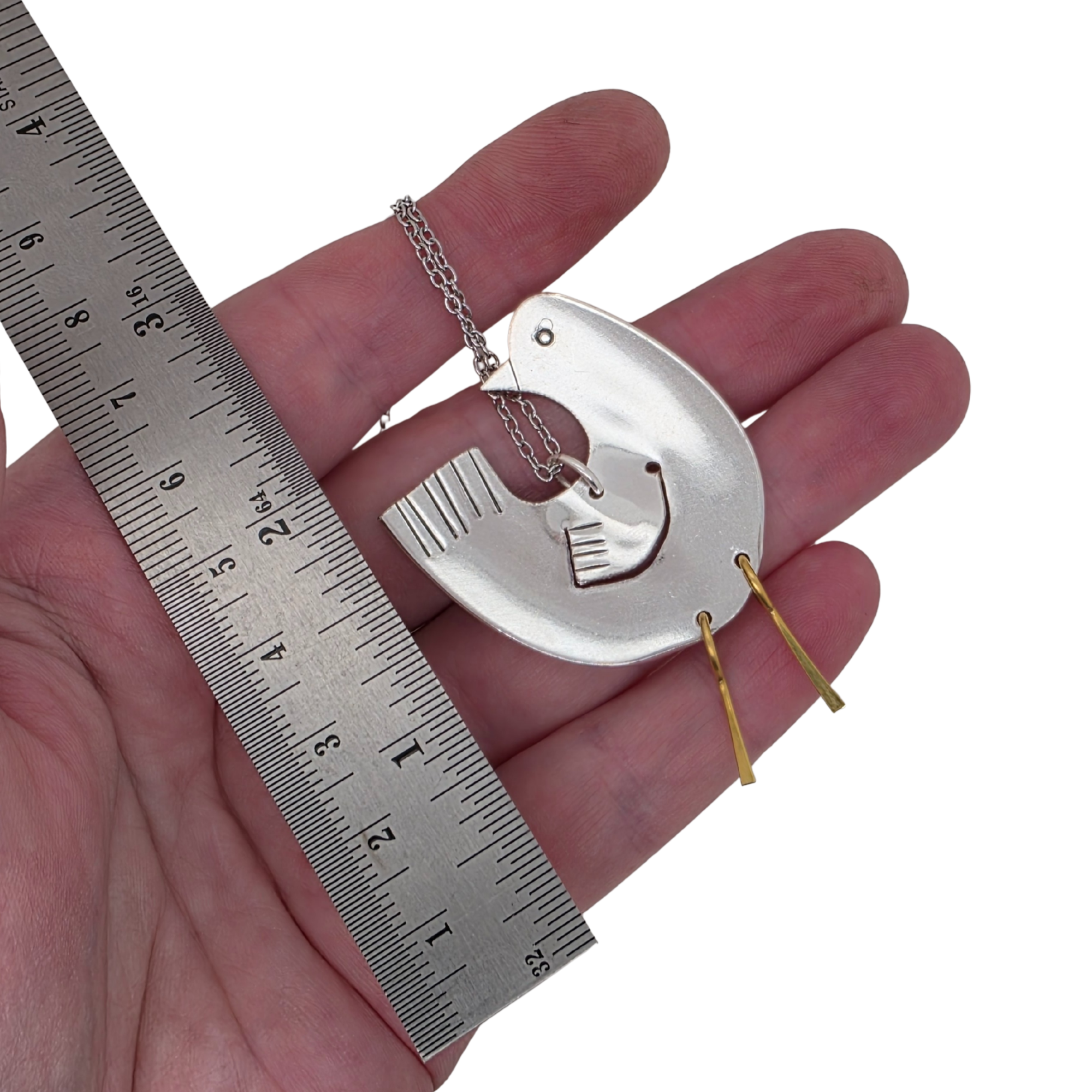 Two brass legs dangle below, adding playful movement and contrast to the cool silver tones. The pendant hangs from your choice of stainless steel or sterling silver chain.