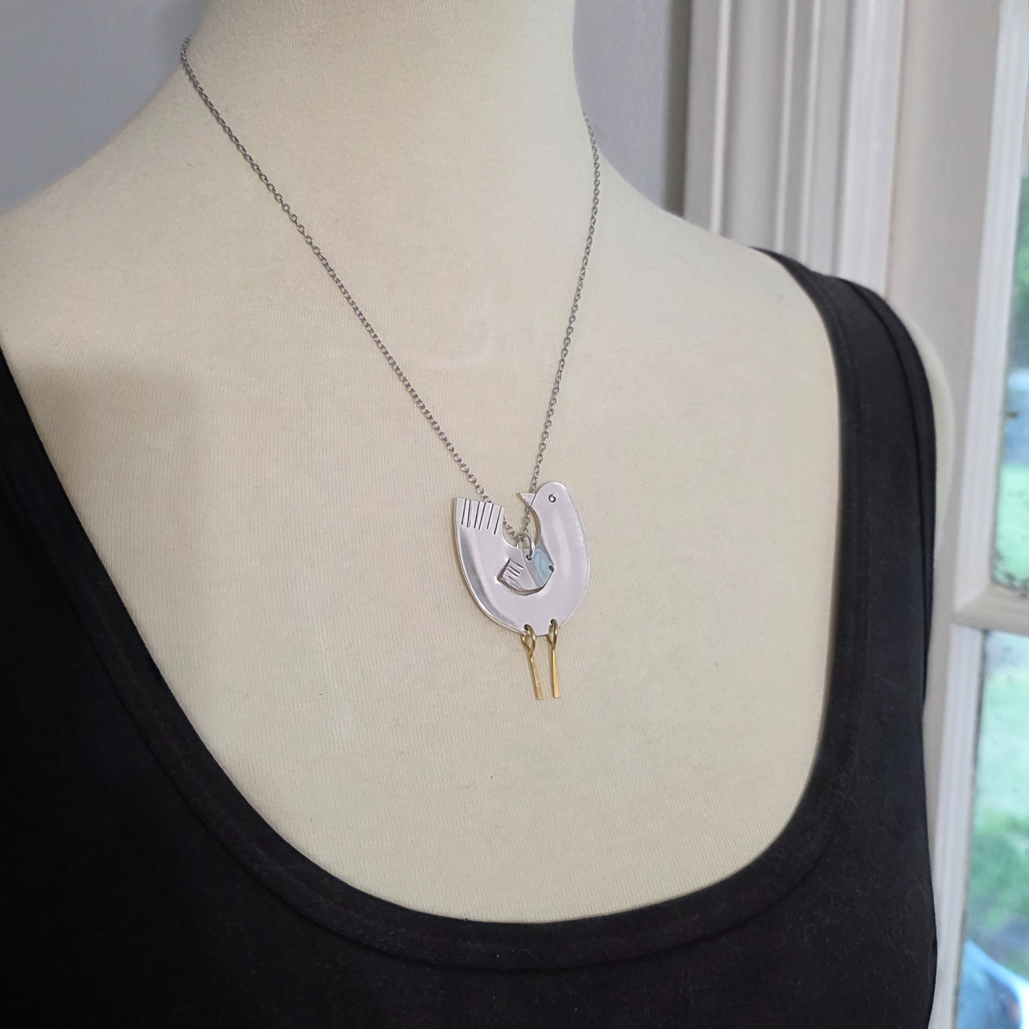 This cheerful Bird Necklace began its life as a vintage silverplated spoon, now beautifully repurposed into wearable art. Hand-cut, shaped, and polished, the pendant features a sweet bird silhouette with a mid century modern vibe.