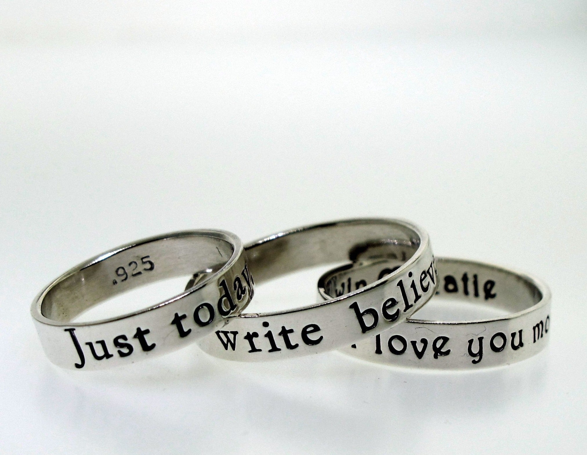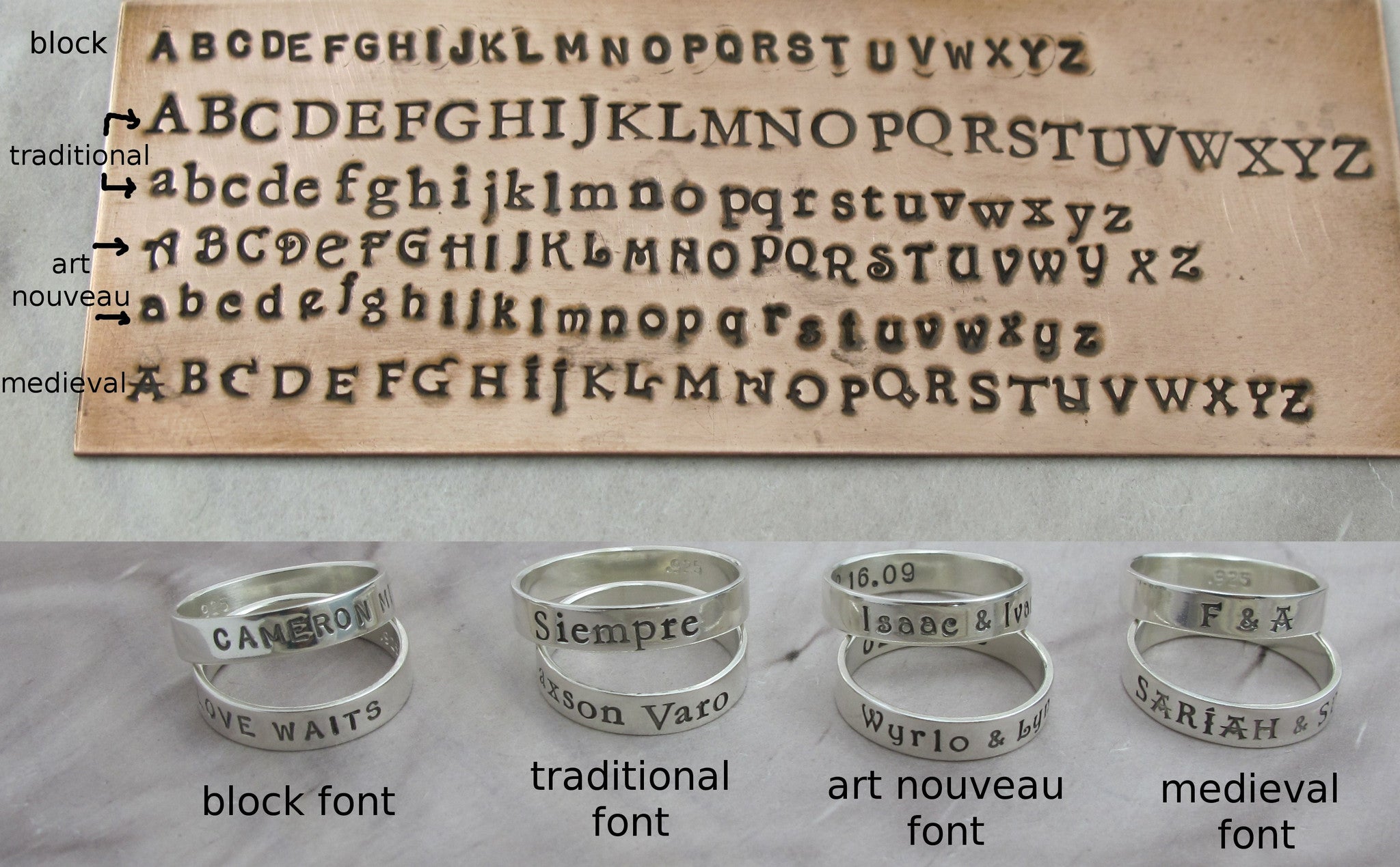 Rings will be made exactly as written (aside from quotation marks). If a word is capitalized, I will capitalize it on the ring. If a letter is in lowercase, I will stamp it in lowercase if possible for your chosen font (block and medieval fonts do not come in lower case.)