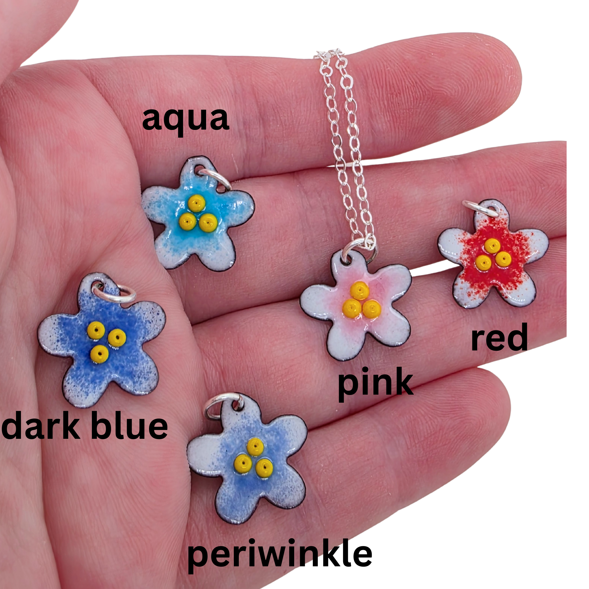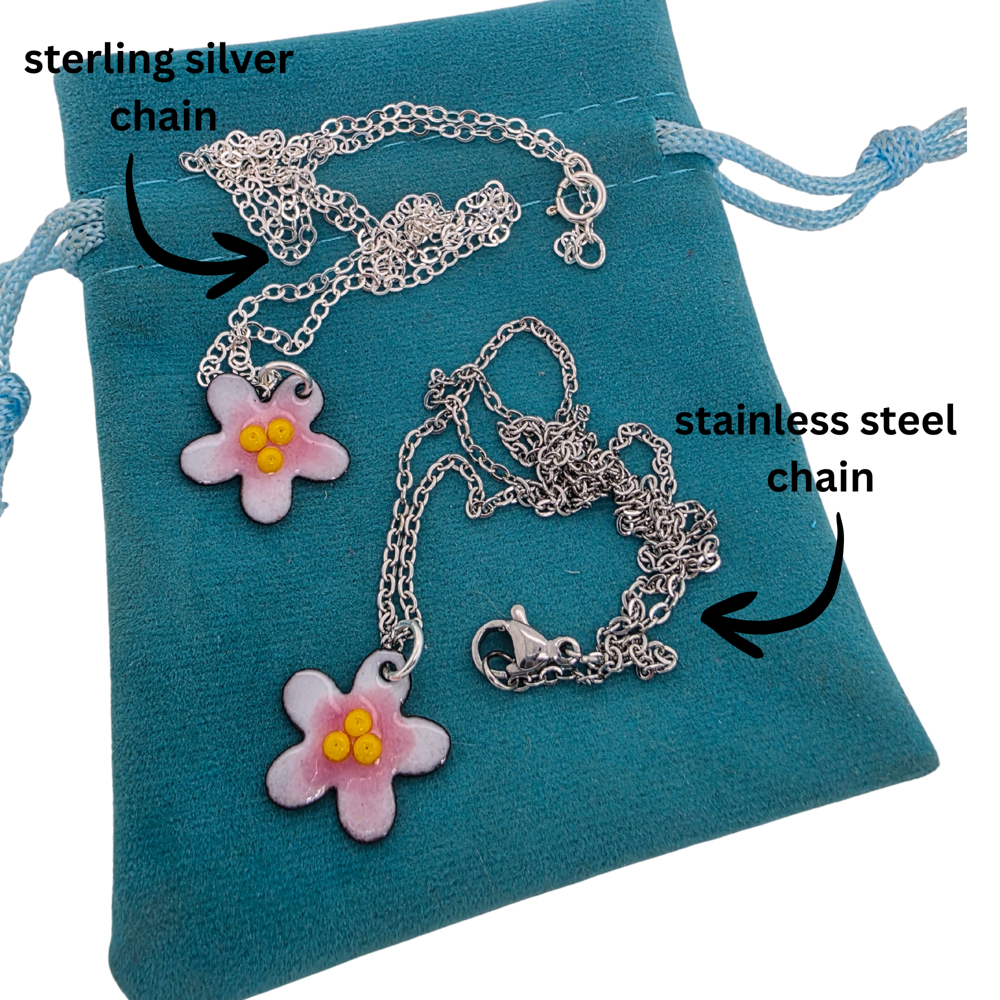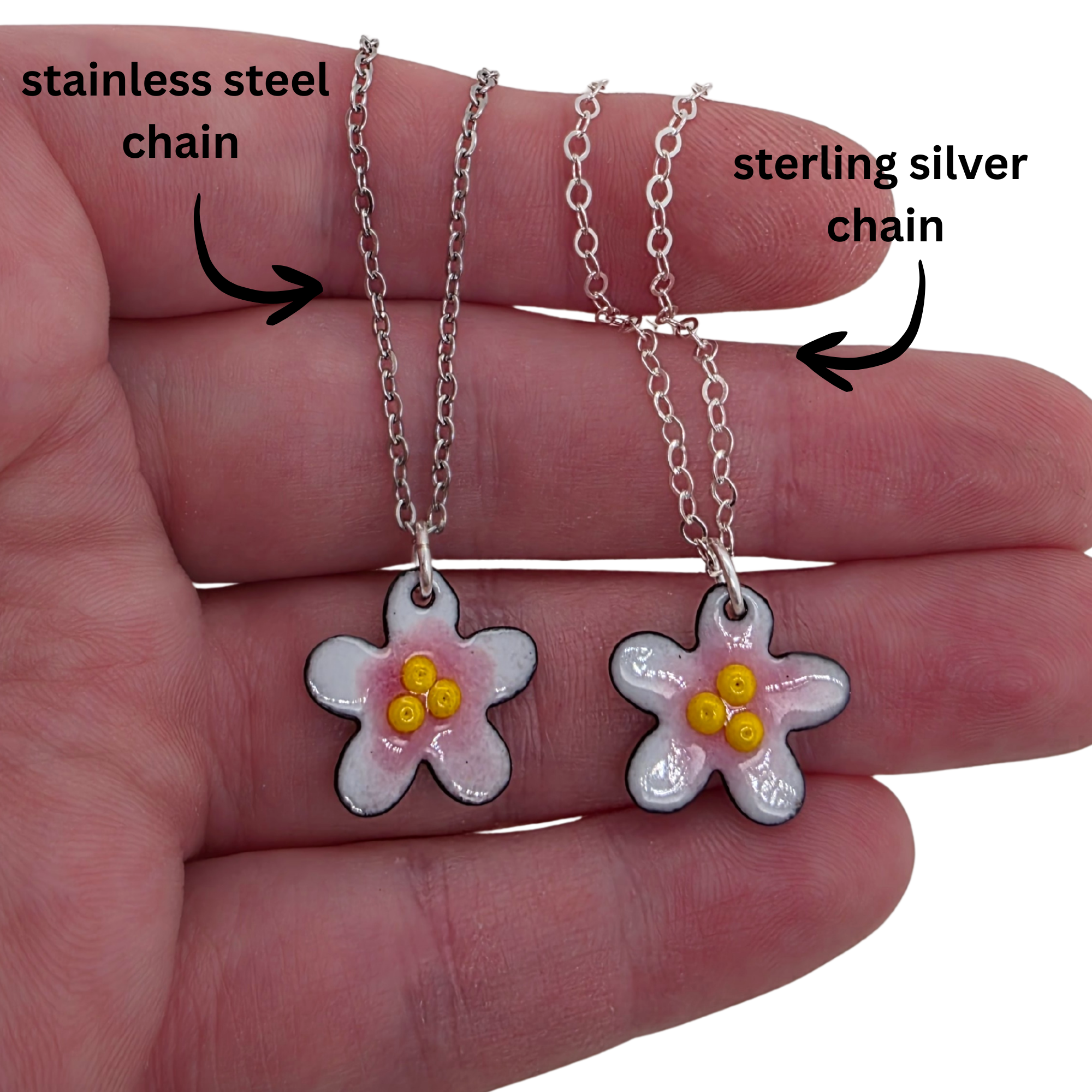 Cheerful handmade enamel flower necklace, available in your choice of color. Each pendant is crafted from glass enamel on copper with a sterling silver or stainless steel chain—perfect for everyday wear or gifting.