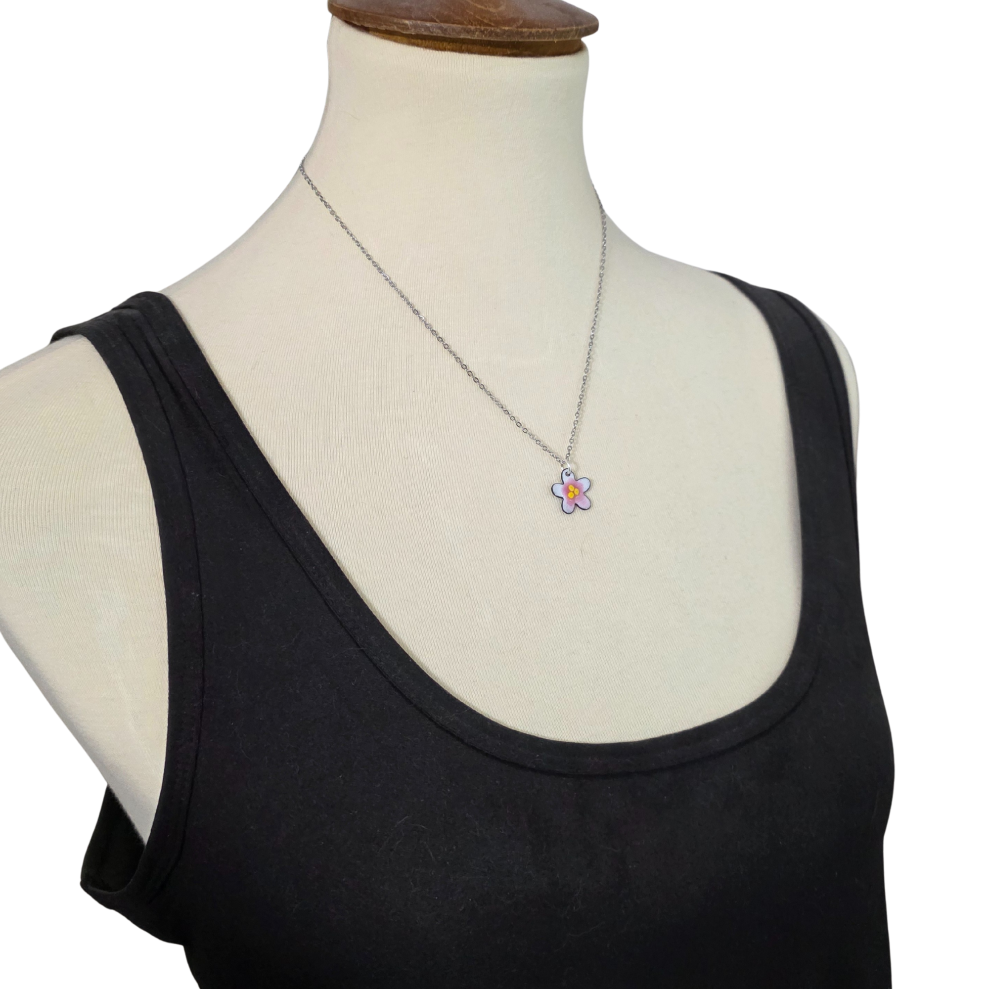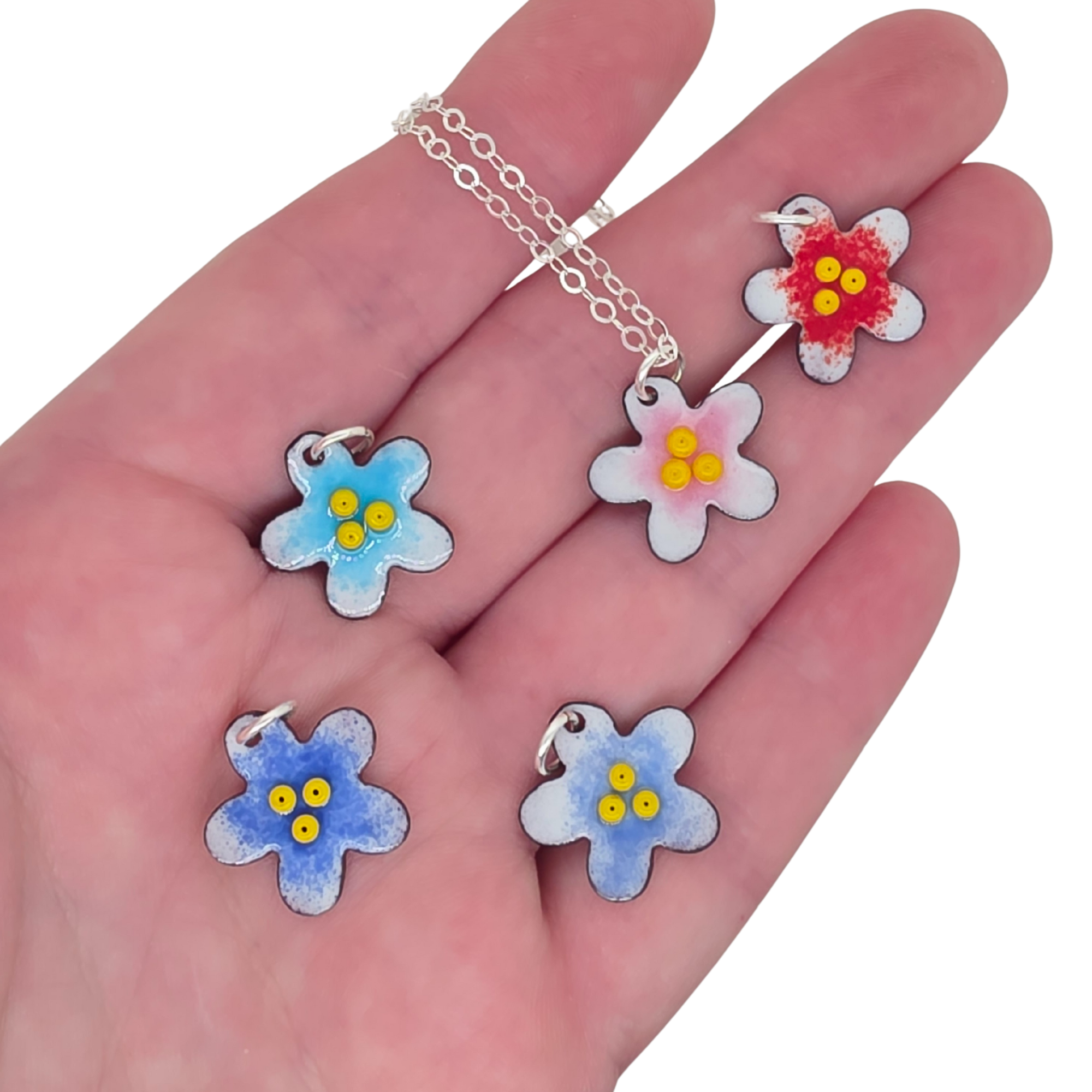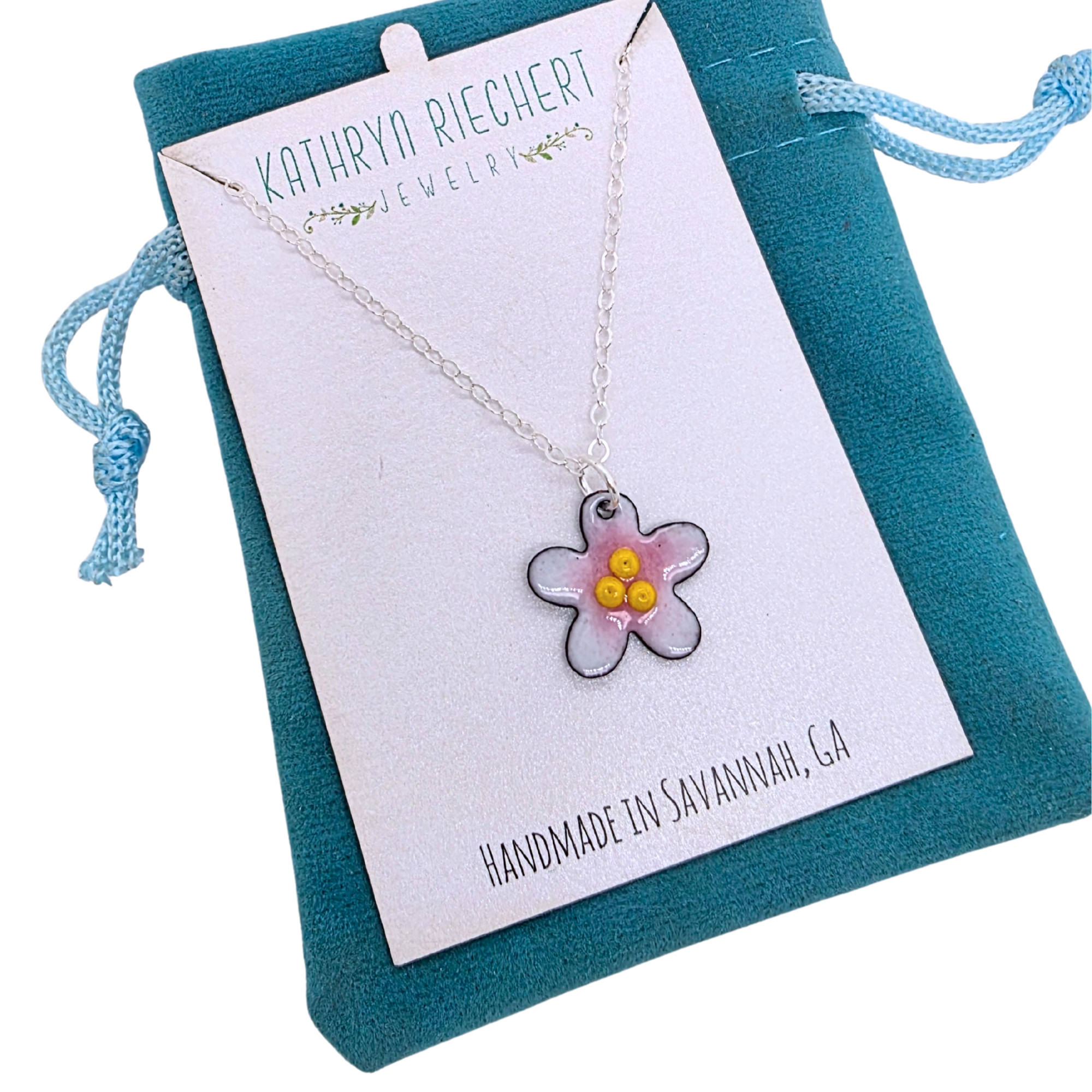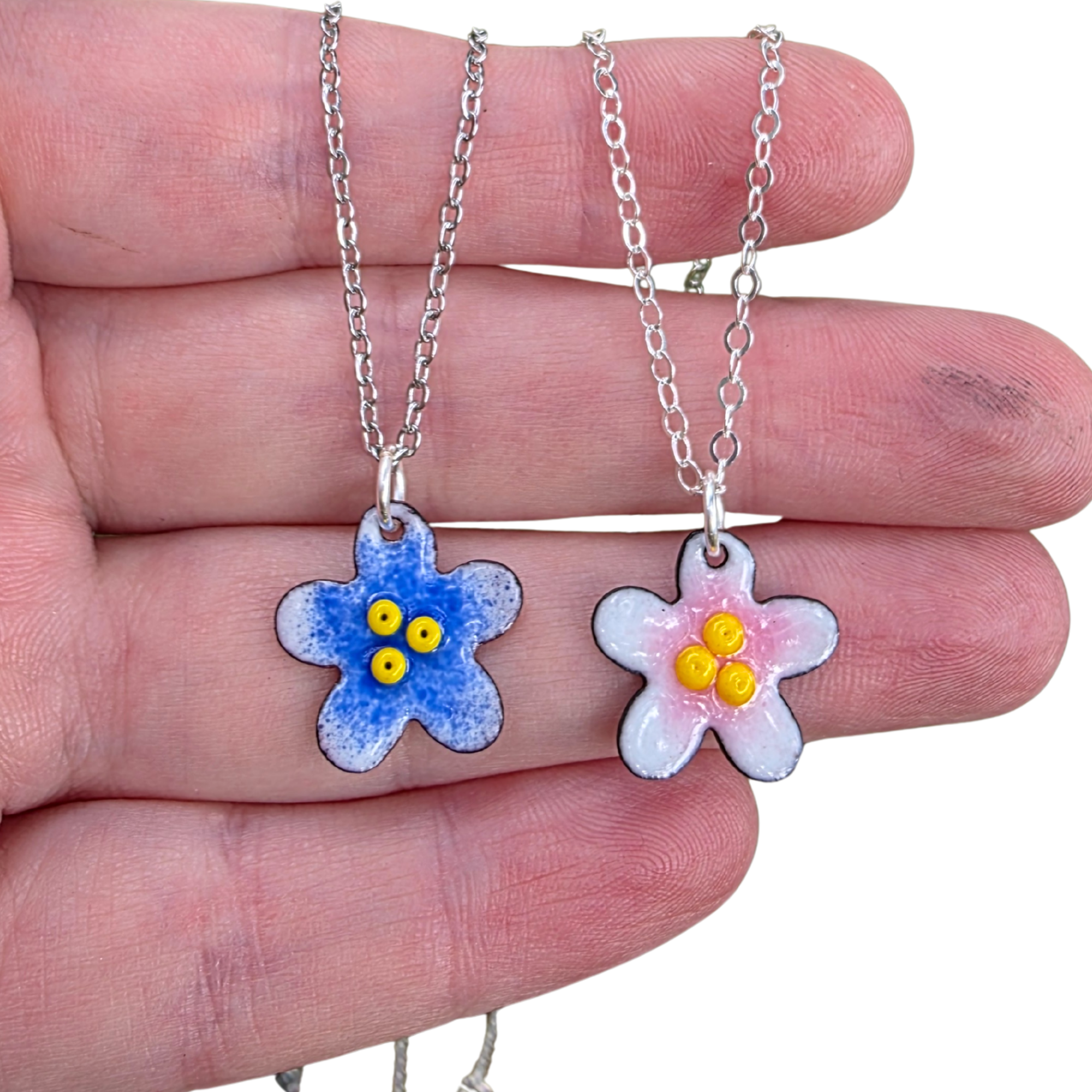 Cheerful handmade enamel flower necklace, available in your choice of color. Each pendant is crafted from glass enamel on copper with a sterling silver or stainless steel chain—perfect for everyday wear or gifting.
