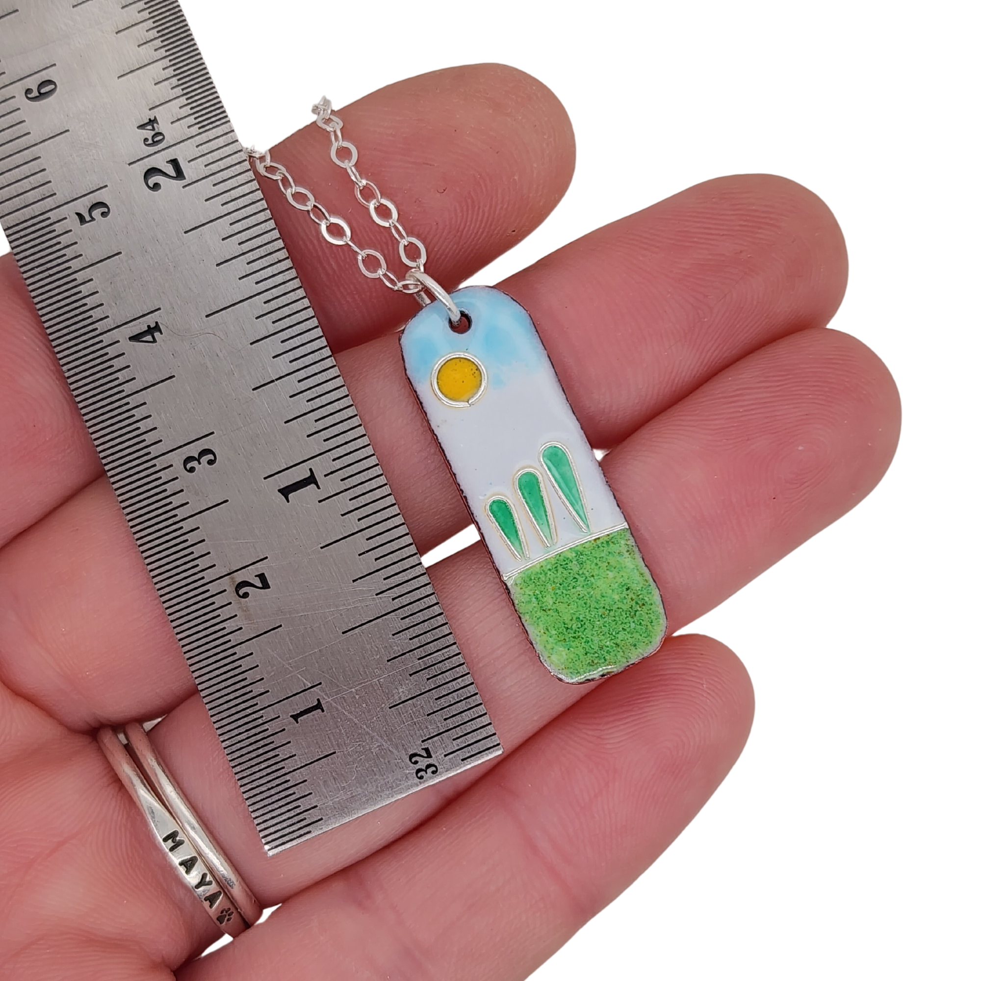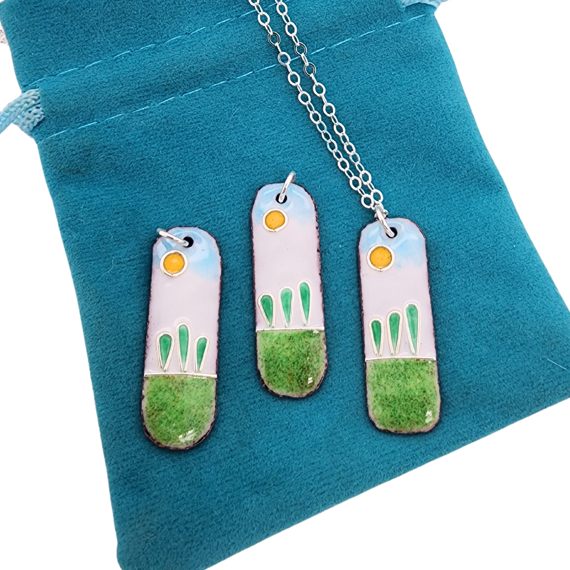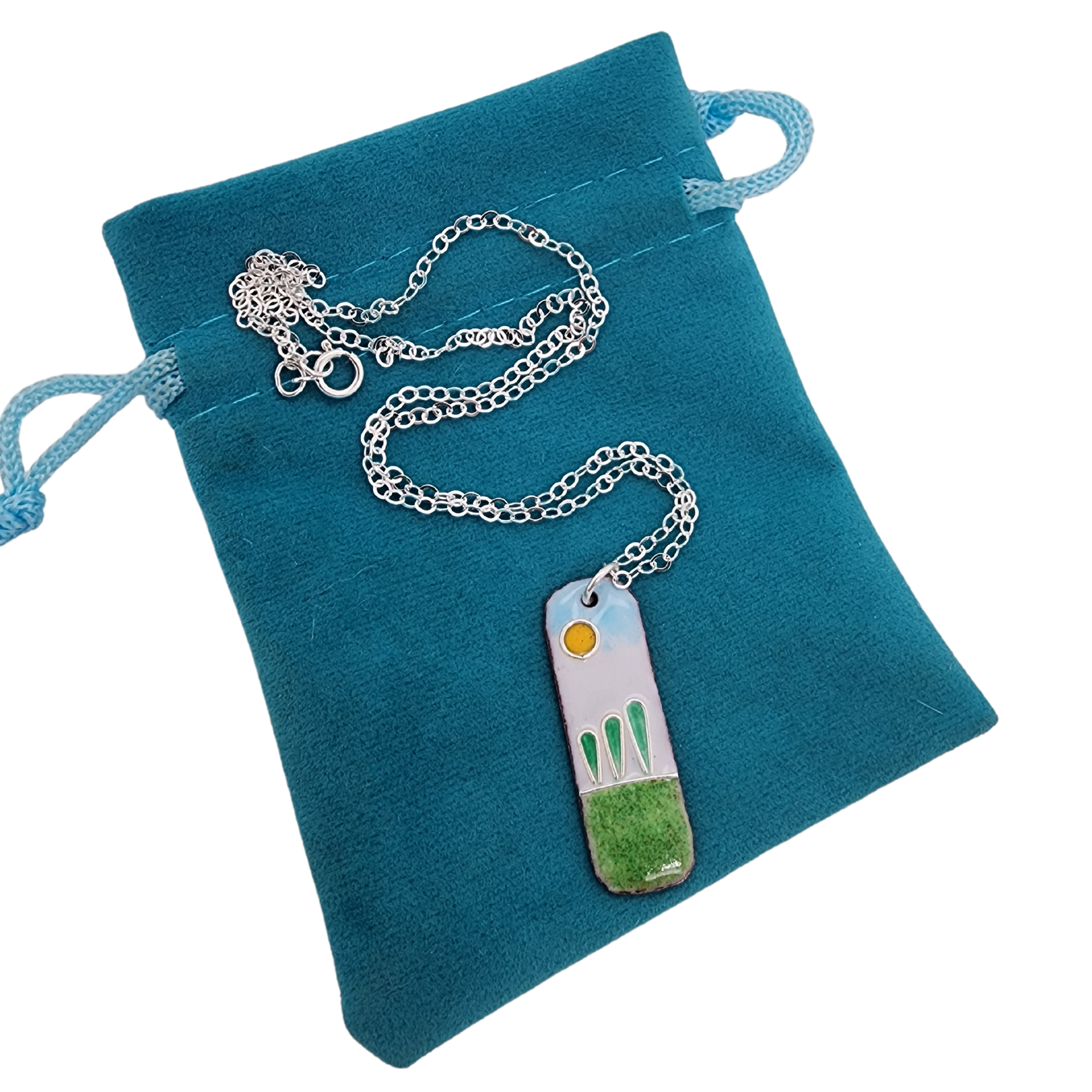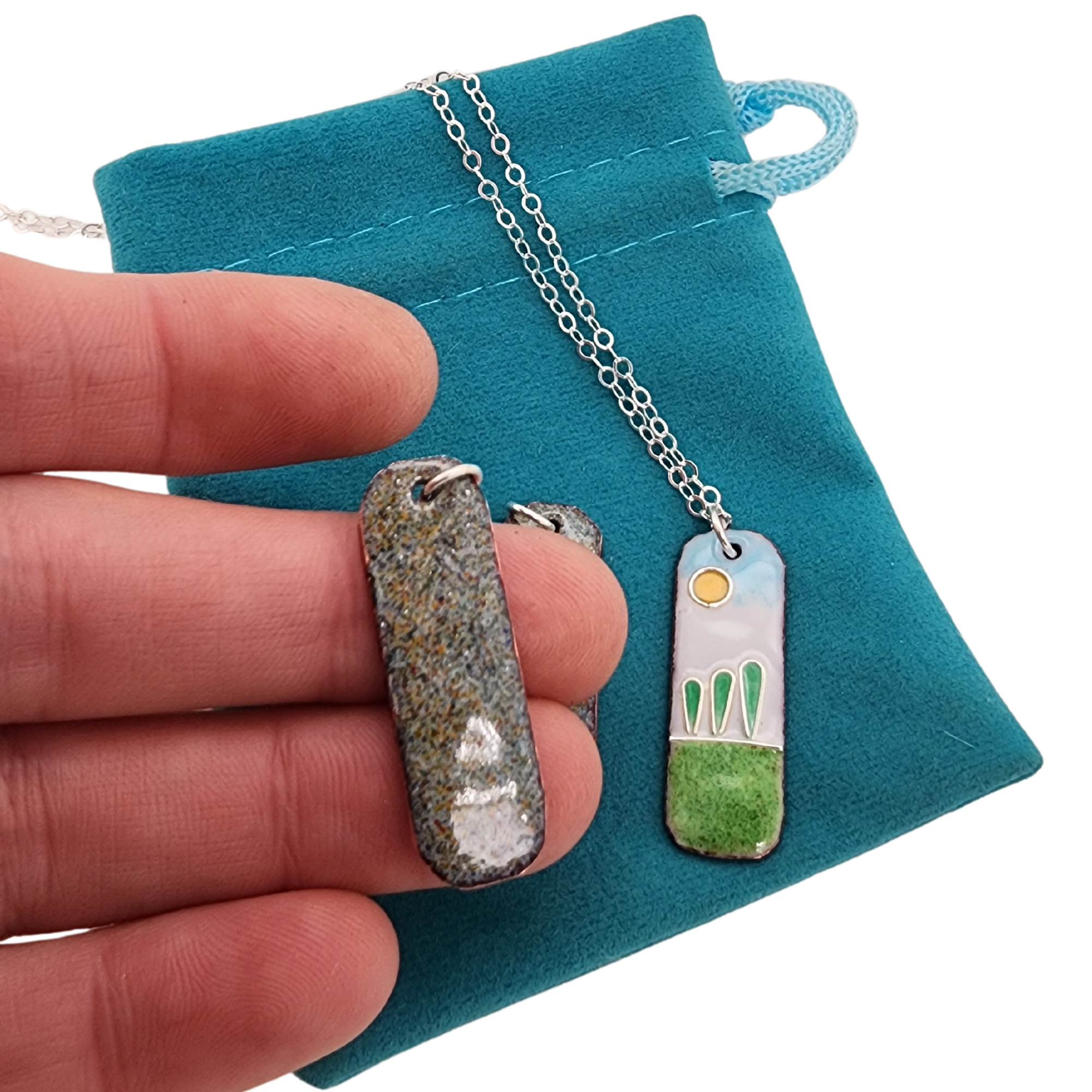 Crafted with meticulous care, each pendant begins as a copper rectangle, transformed with curved edges to create a distinctive organic shape. The glass enamel, fused to the copper canvas, comes alive with embedded fine silver wires, adding a touch of sophistication to the vibrant design.