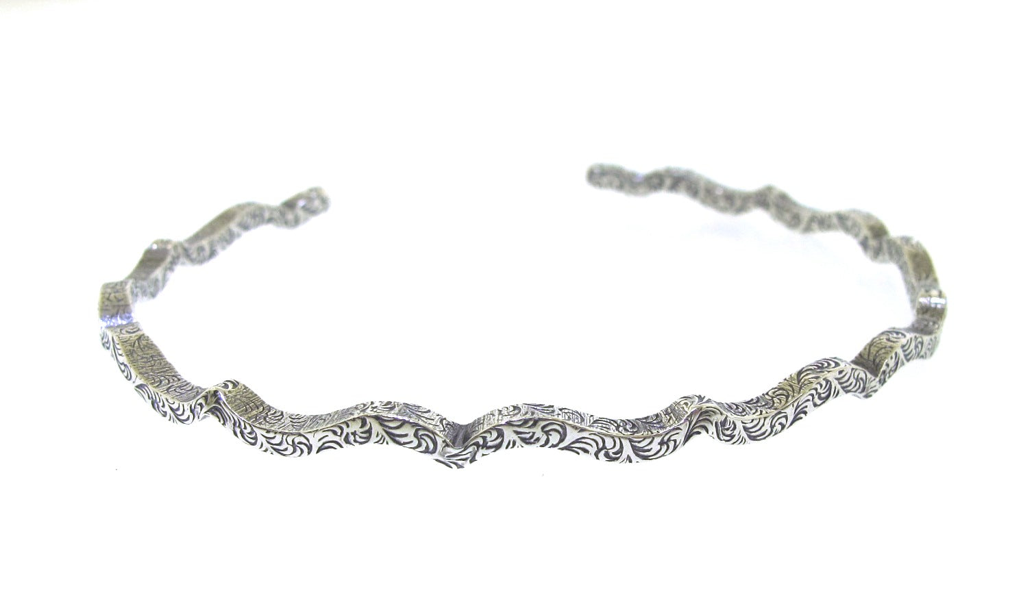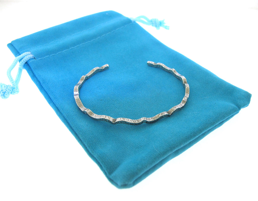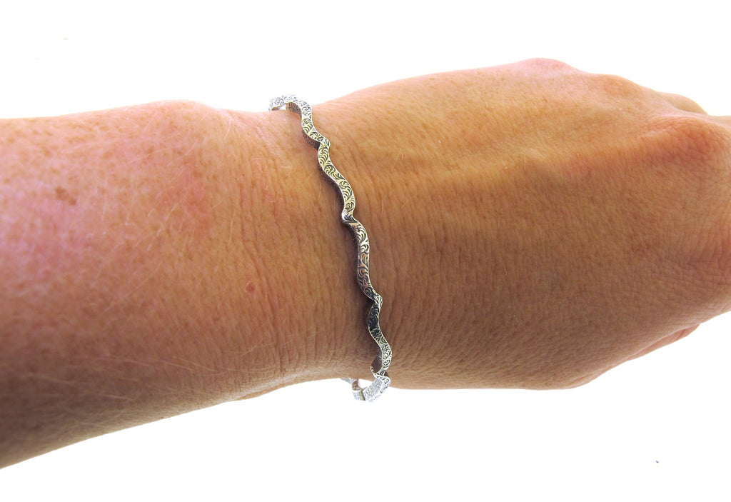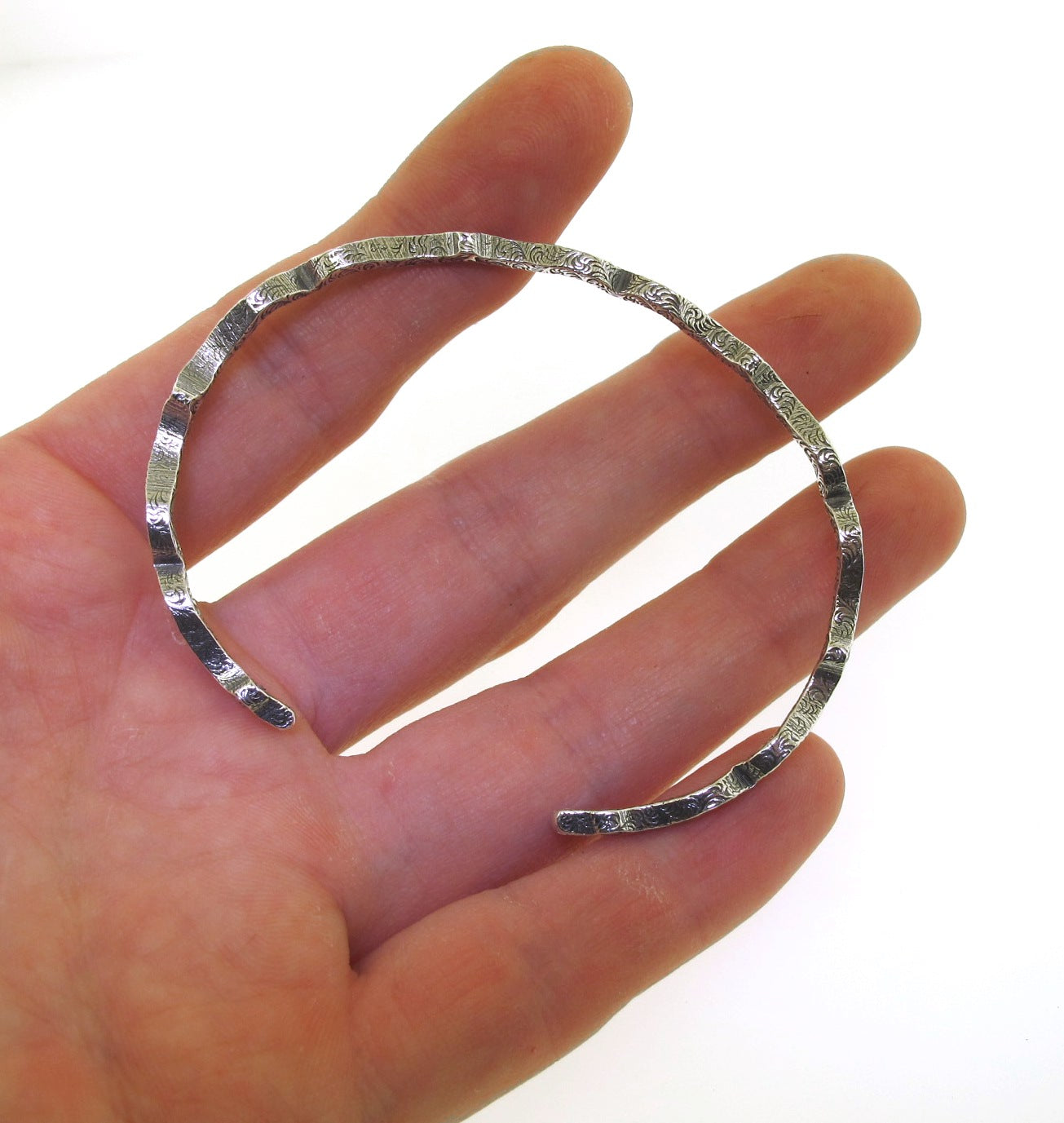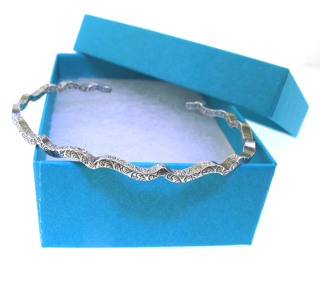 This is my newest style of cuff bracelet created from solid sterling silver. The metal has a swirly pattern on all sides and it is formed in a press to give it the shape you see. I add a patina to the bracelet to bring out all the details in the pattern.