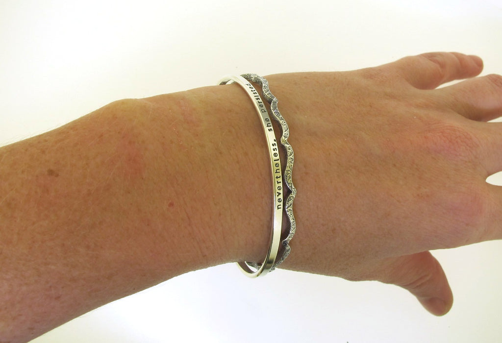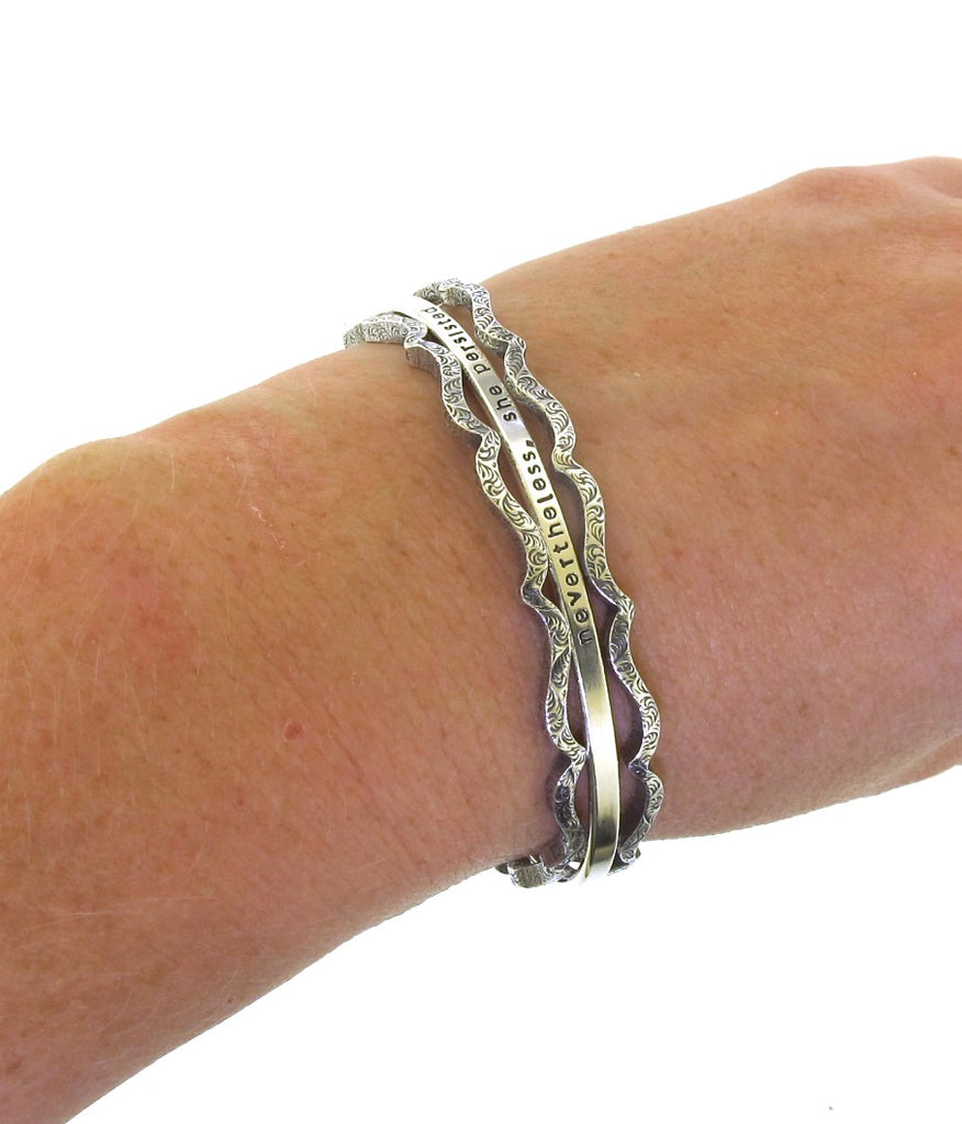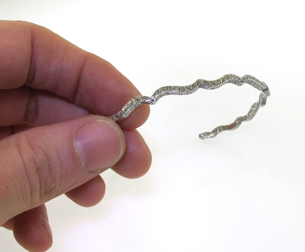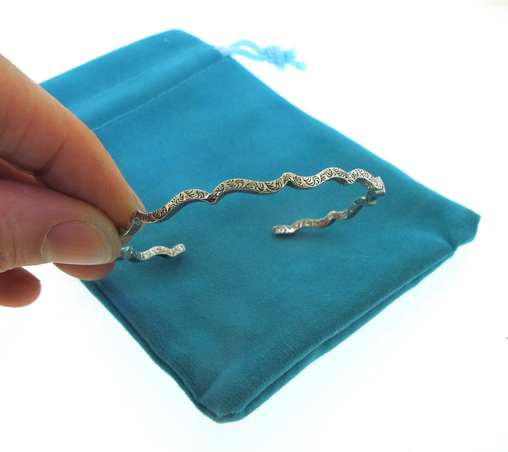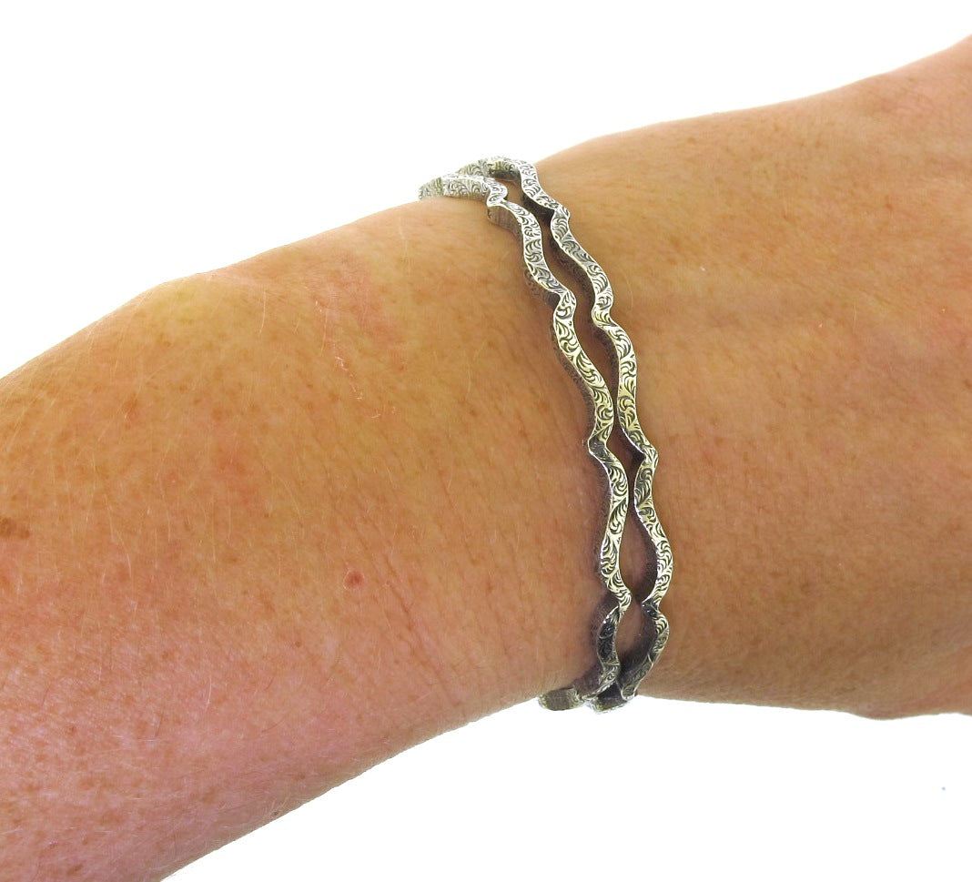 This is my newest style of cuff bracelet created from solid sterling silver. The metal has a swirly pattern on all sides and it is formed in a press to give it the shape you see. I add a patina to the bracelet to bring out all the details in the pattern.