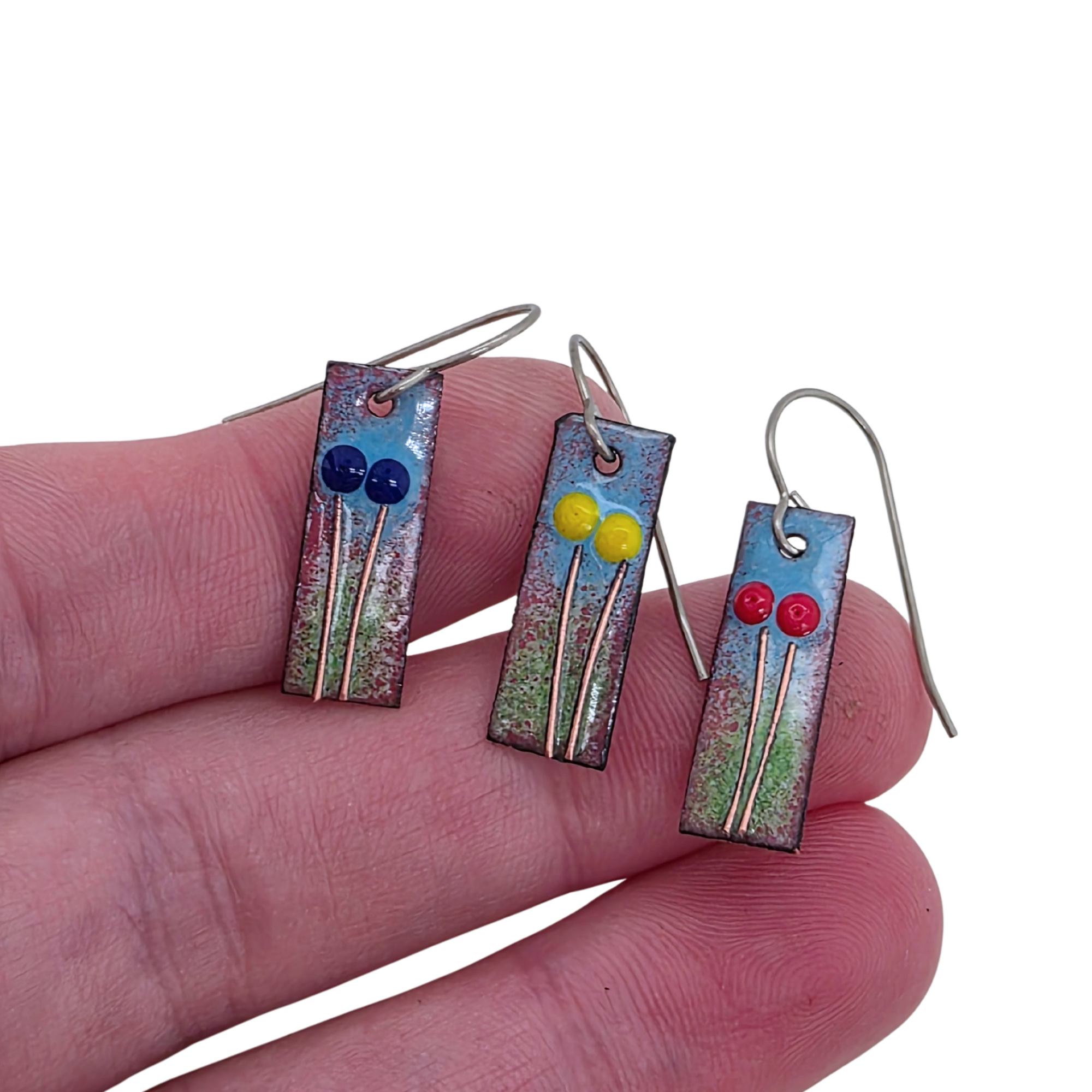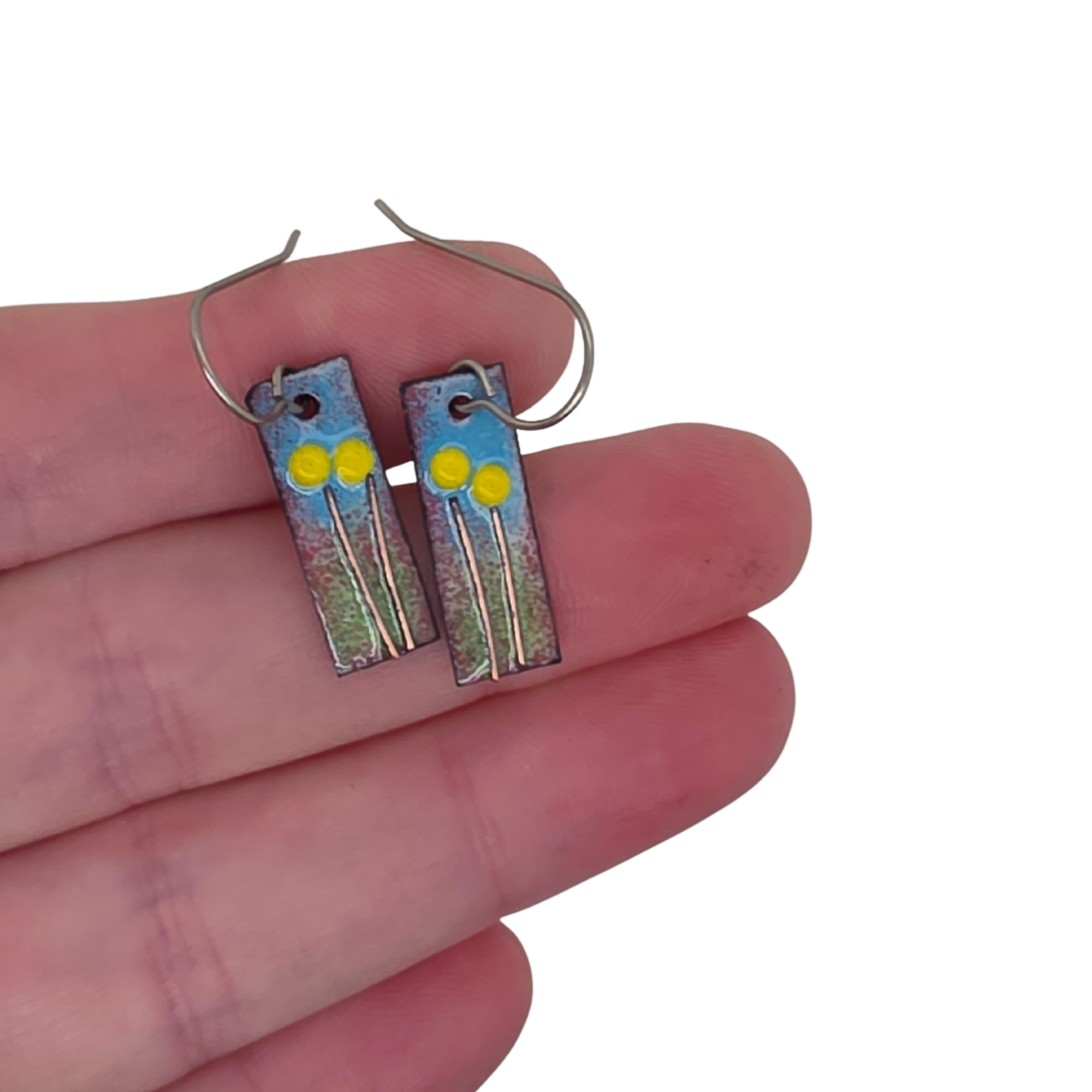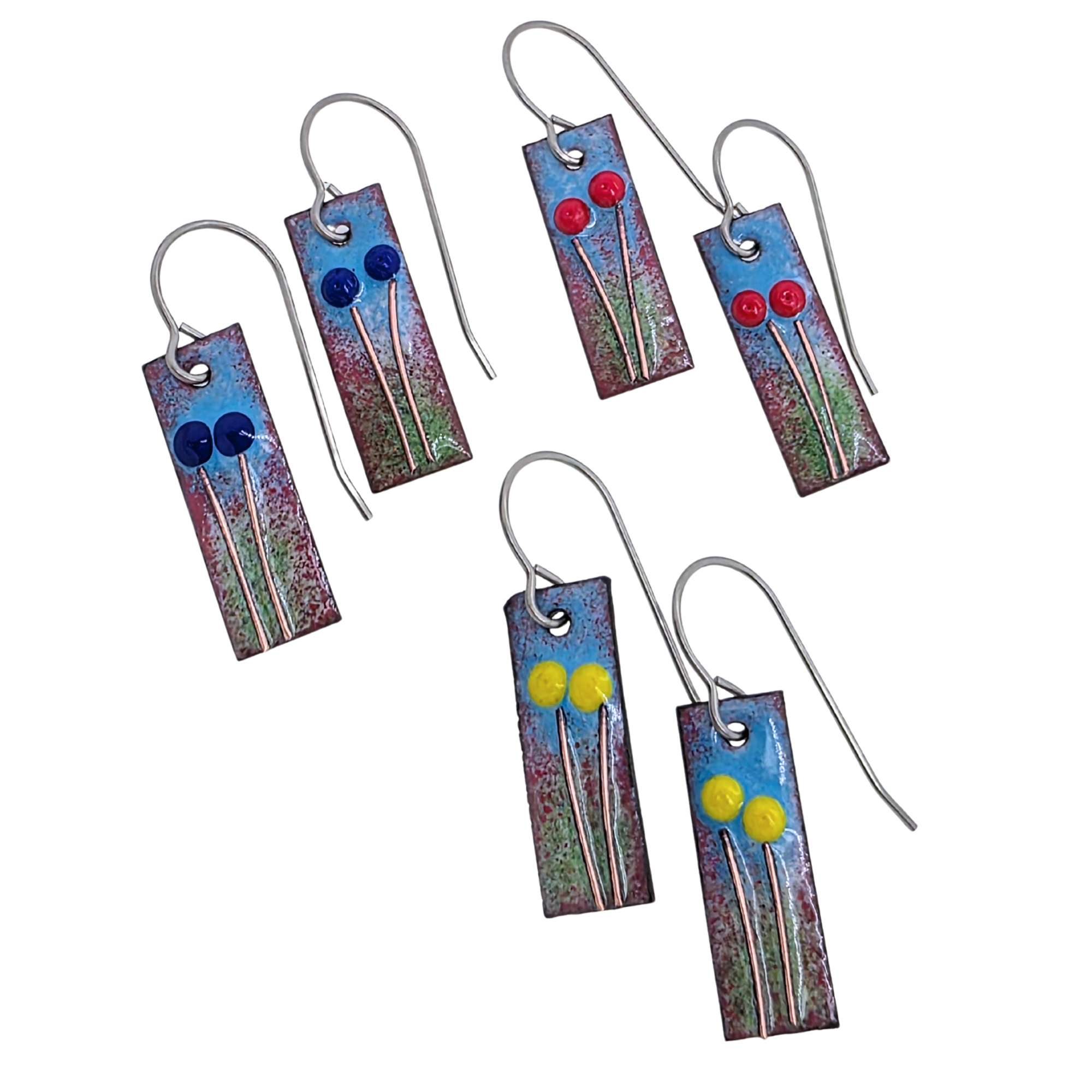 These Wildflower Earrings are inspired by simple blooms growing freely in a field. Each pair is handmade from glass enamel fused to copper, featuring a softly blended background with slender copper stems and raised enamel flowers. Available in several color options.