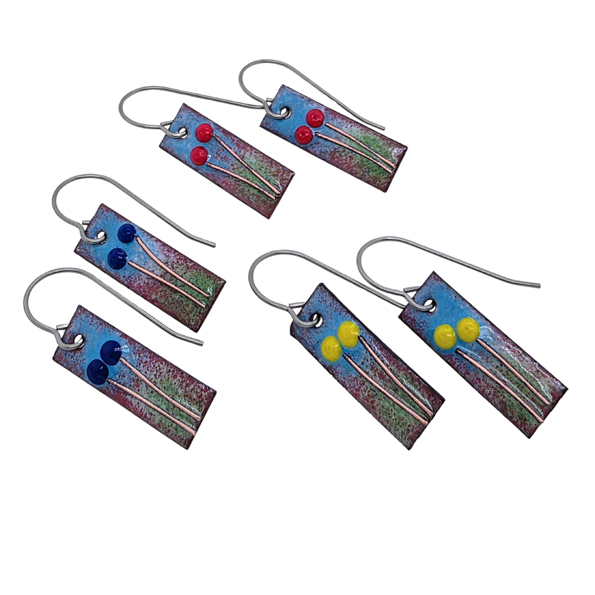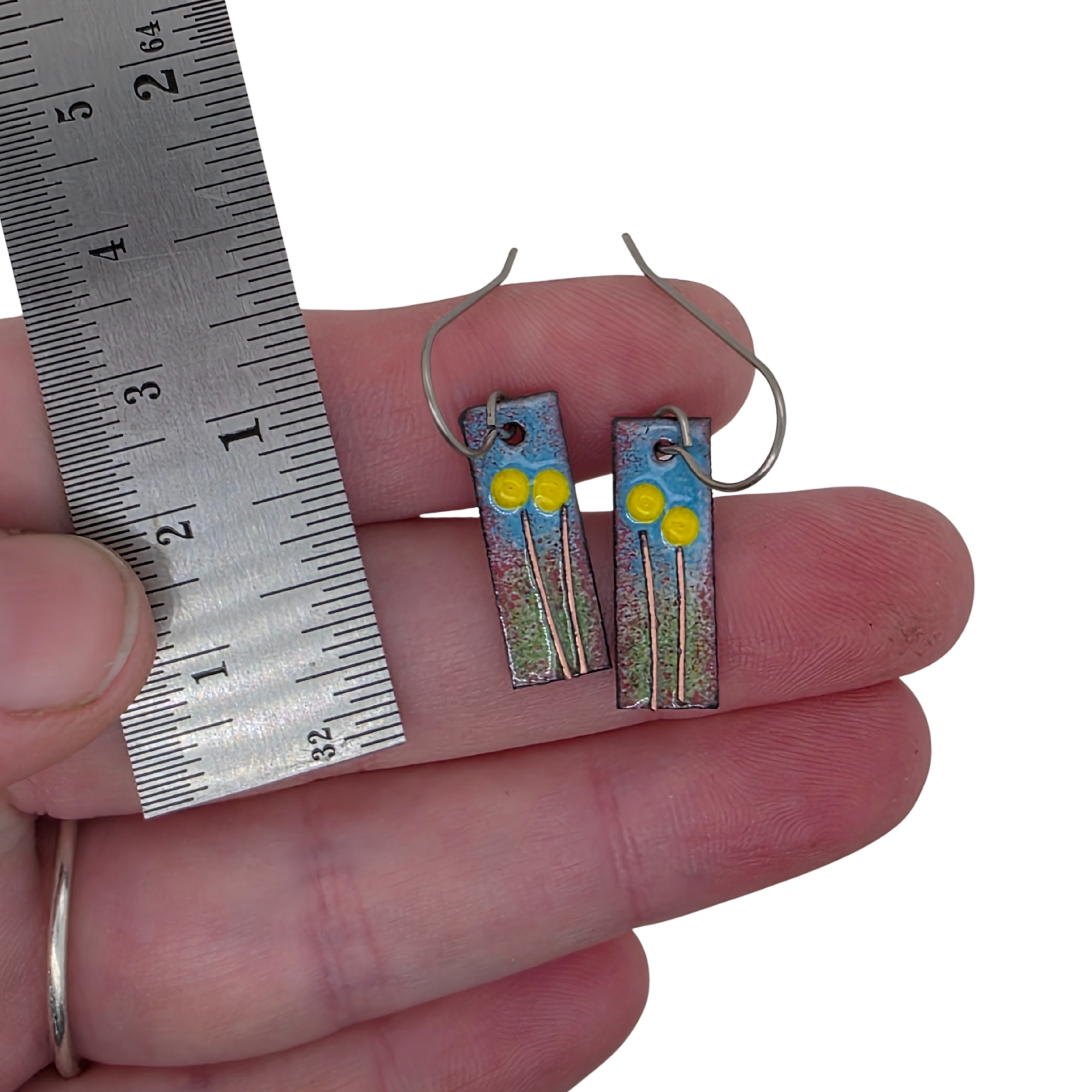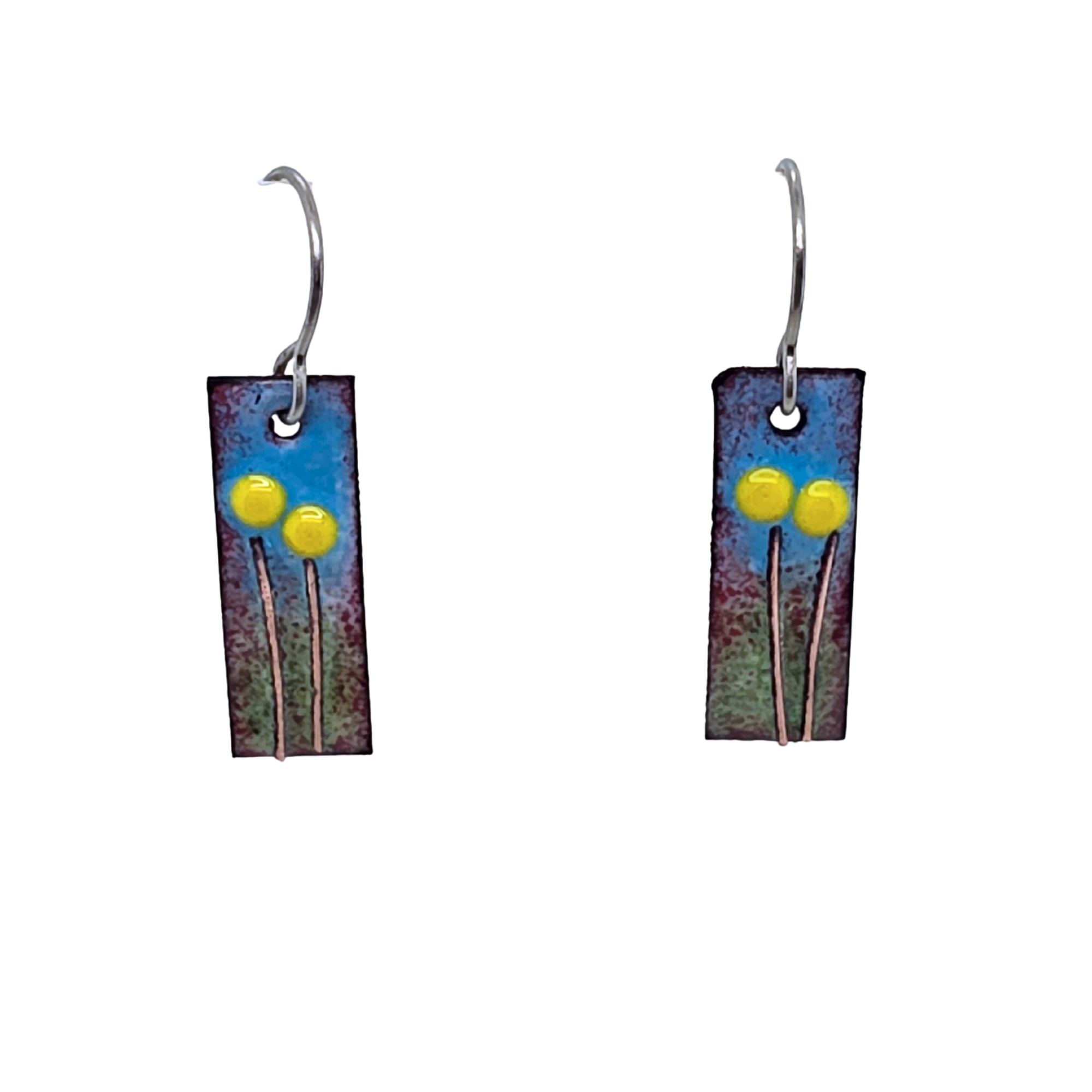 These Wildflower Earrings are inspired by simple blooms growing freely in a field. Each pair is handmade from glass enamel fused to copper, featuring a softly blended background with slender copper stems and raised enamel flowers. Available in several color options.